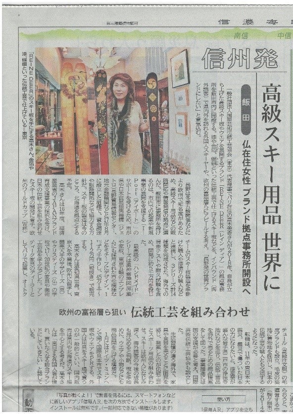 信濃毎日新聞の掲載記事。世界に向けて「Reine Deer」商品を販売するにあたり、4年に一度の世界的な大会のあった長野県に事務所を設立。写真は東京・港区青山の骨董通りにあるギャラリーの一角を使わせていただいているショールームです。記事の詳しい内容はこちら