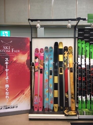 国内最大の小売店の予約販売会の一会場で。真ん中のスキー板の前にあるのが試作サンプルの漆ストック。