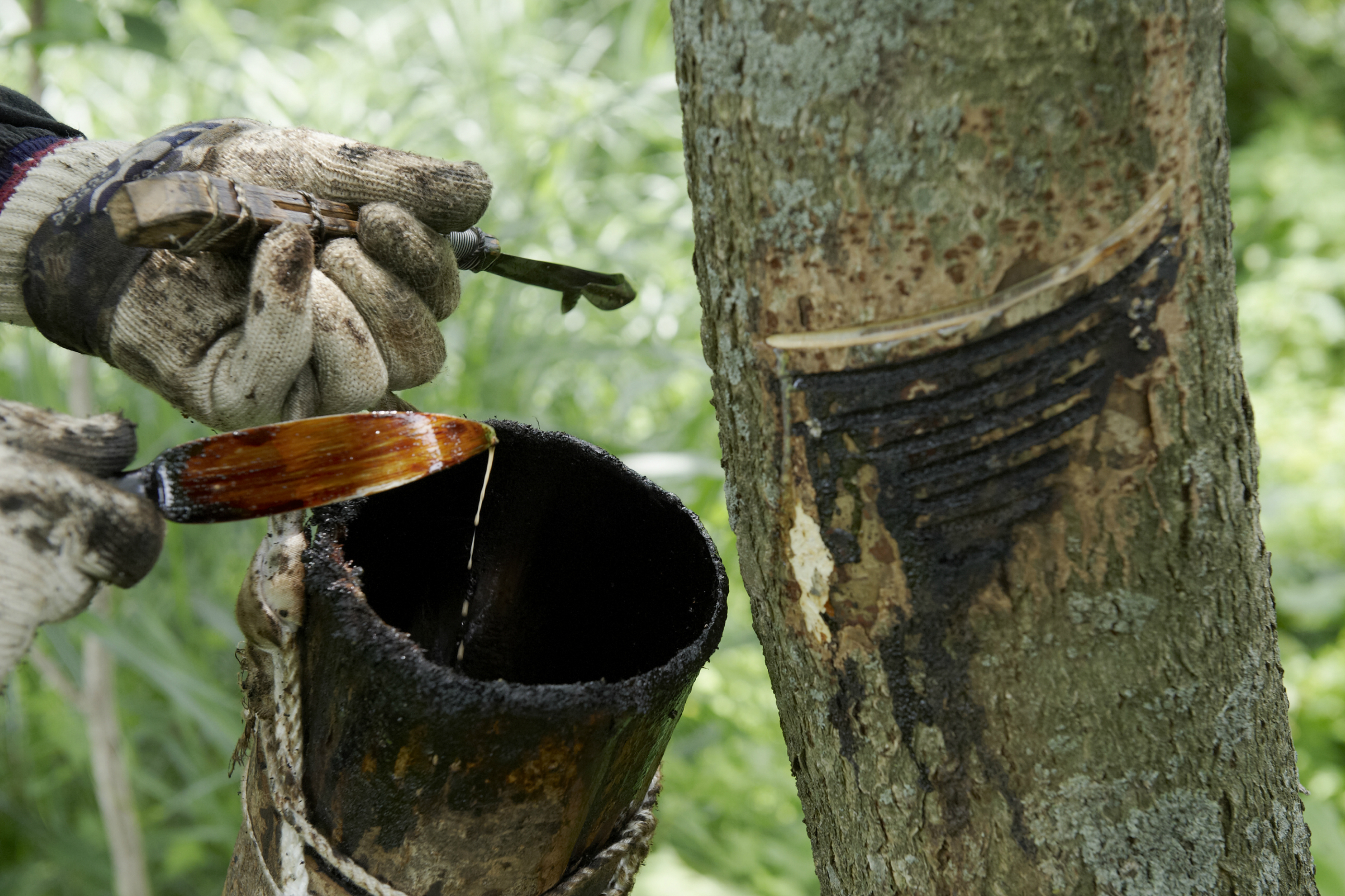 「漆」の木の樹液。自然の色は、透明な茶色。ウルシノキ。「漆」の木の幹につけた傷口からしみ出てくる乳白色の樹液を、6月から10月にかけて採集し(掻き)ます。漆掻き職人は、1年に400本の木を担当。一本の漆の木から4日に一回漆を集め、合計およそ150g。お椀にして約20個分の漆液を採ります。