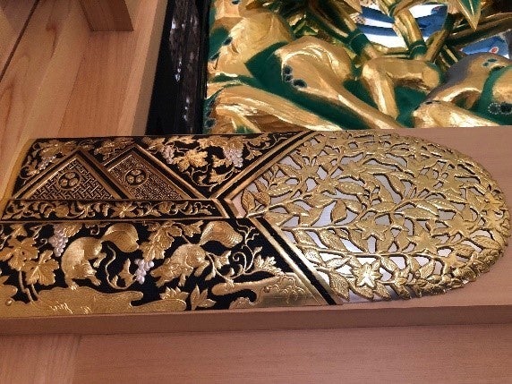 左の獅子は「蒔絵」、目に「螺鈿」、黒い「漆」に「金箔」を散らしてあります。右の風神雷神は「金箔」が背景に。右と左で違うデザインも可能なカスタマイズシステムです。