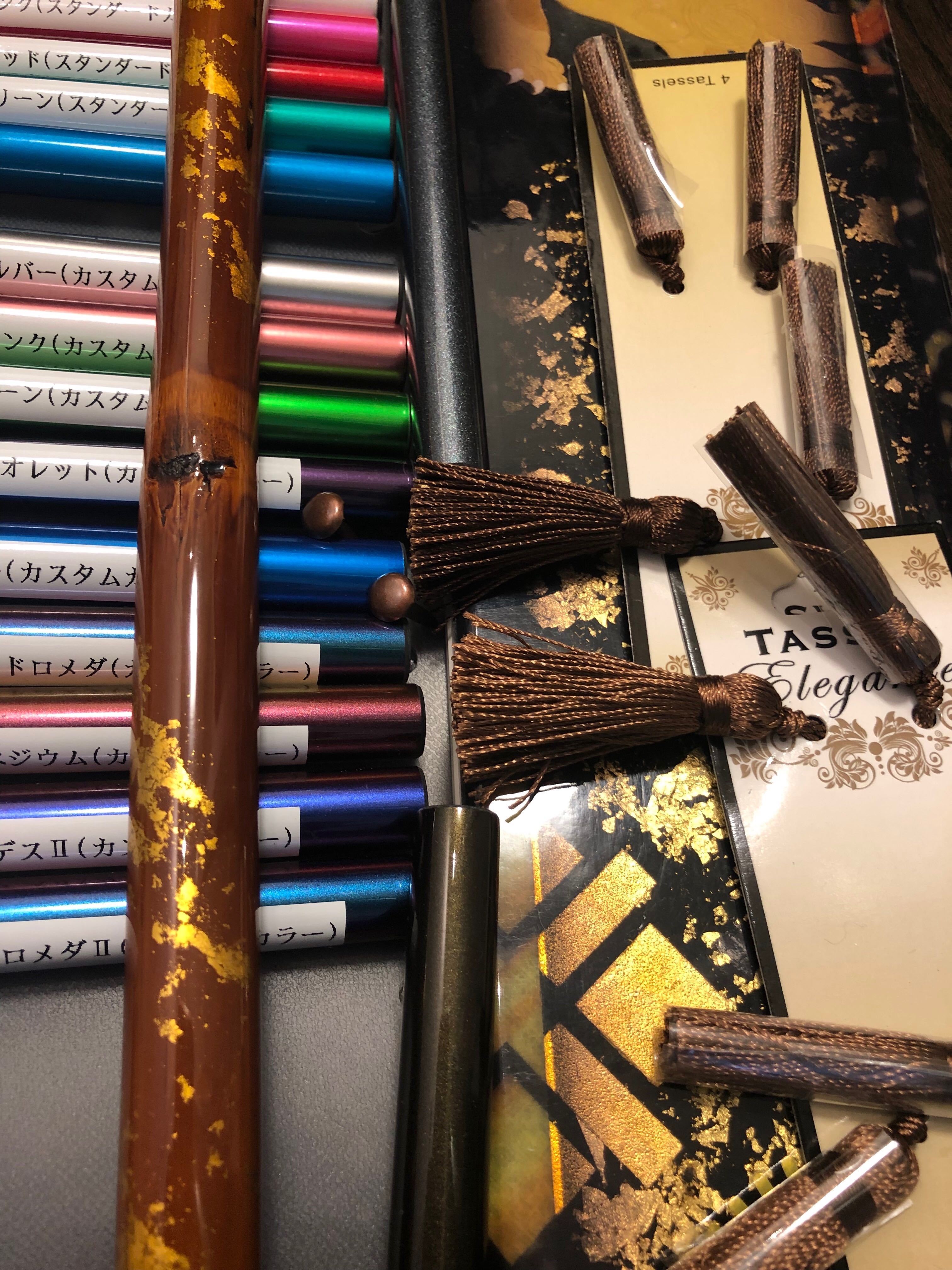 市販の竹のスキーストックに、「漆」と「金箔」を施してみた試作品