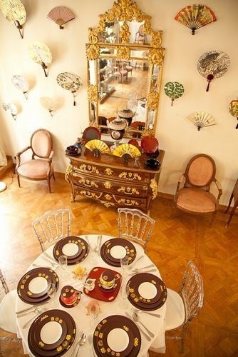岩手県由来の南部箔モチーフを用いた「漆」と「金箔」を施した西洋皿を用いたテーブルセッティング。パリのアパルトマンでのサロンをイメージ。