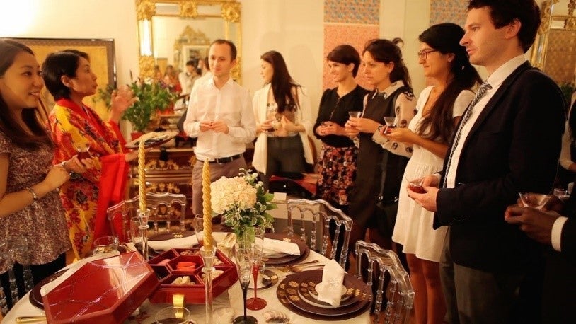 色打掛のソファーカバーなど、日本の伝統工芸品をフランスのインテリアへ取り入れたスタイルを提案。試食という「漆器」を使う体験付きの「漆器」を用いたテーブルデコレーション展示会。フランス人から様々な意見感想のヒアリングができました。