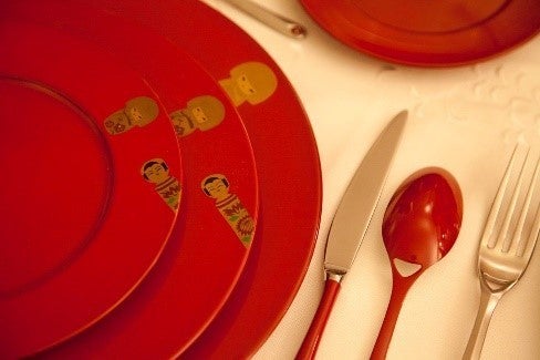 漆器の良さは、その口当たりの良さにもあります。ところが、西洋人の食生活では、食器を口につけることがありません。そこで、スプーンなどの口につけるカトラリーに「漆塗料」を施し、少しでも漆の良さに触れてもらえるようにしました。お皿にはヨーロッパで大人気の現代的な女の子のイラスト風なKOKESHI(こけし)とともに、その由来を知ってもほしく伝統的なこけしの「蒔絵」を施しました。