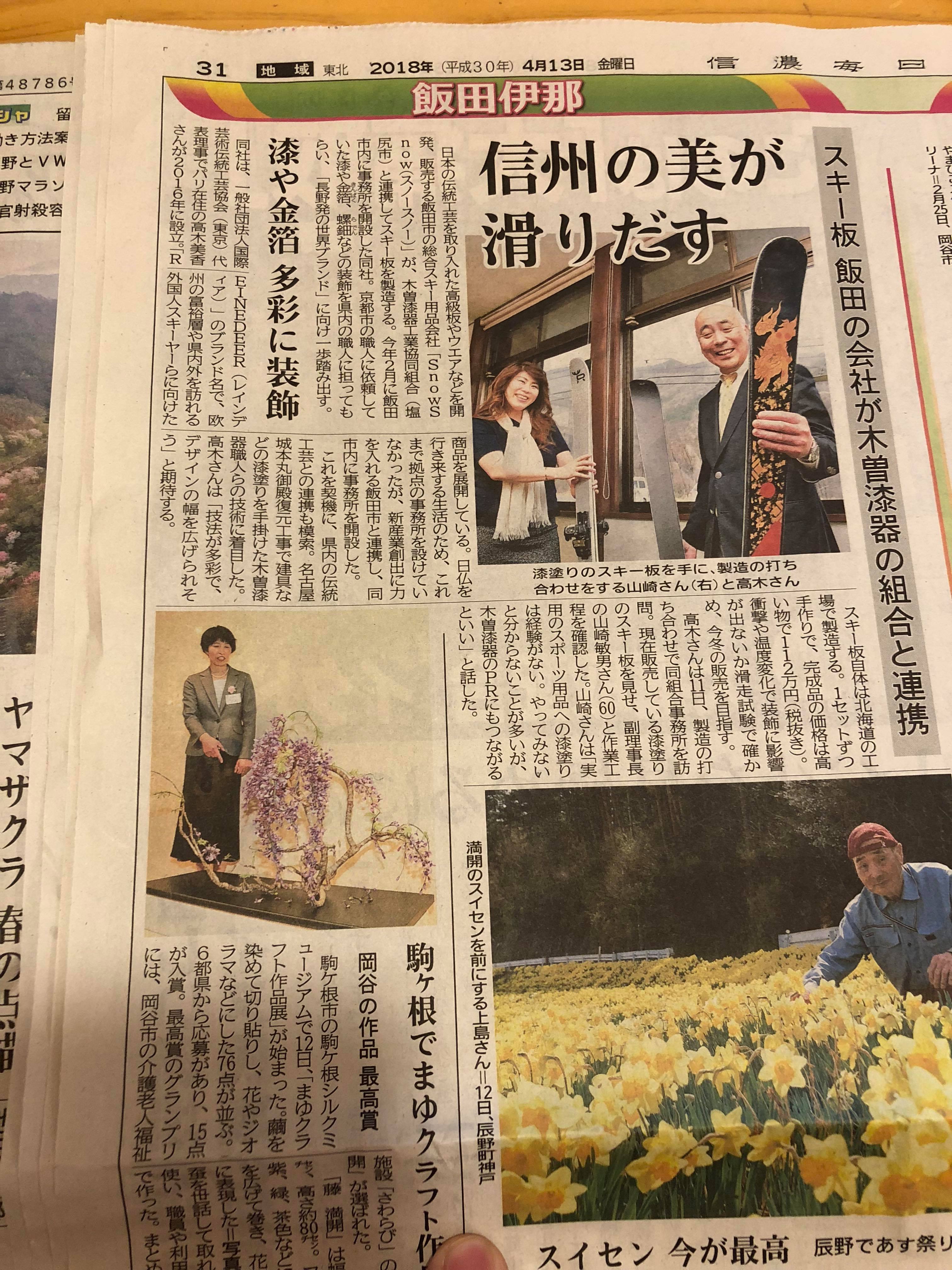 信濃毎日新聞掲載記事。木曽漆器工業協同組合との提携について。スーツをお召しですが、木曽漆の伝統工芸士さんです。