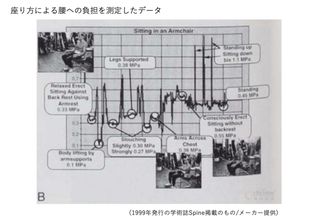 以下のデータでは、座った時の姿勢によって腰にどの程度負担がかかるかが掲載されています。