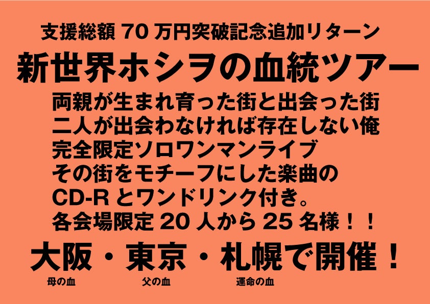 両親が生まれ育った街、東京、大阪。そして両親が出会い僕が生まれるきっかけになった街、札幌の3都市で、今回のプロジェクトリターン限定ソロワンマンライブにご招待させていただきます。