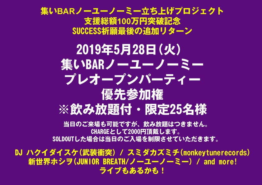 2019年6月1日ついにオープン!に伴いまして、2019年5月28日、プレオープンパーティーを開催します!DJにデスベア・武装衝突のハクイダイスケ、ノーユーノーミーの旗印をデザインしていただいたmonkeytunerecordsのスミダカズミチ、and more! ライブも企画中です。