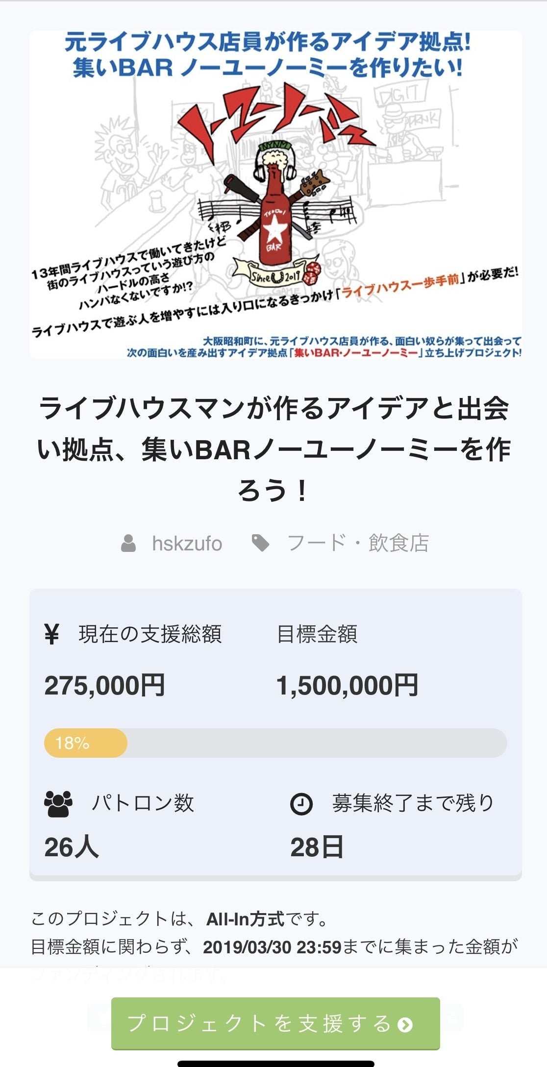 ここまでの2日間。ともに10万円超のご支援をいただきまして、現在達成率18パーセント、275000のご支援をいただいております!本当にありがとうございます!