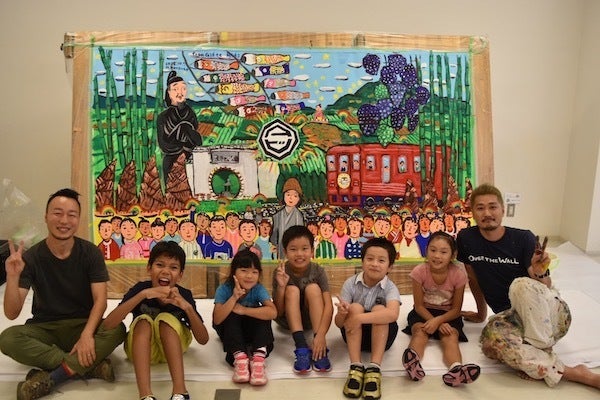 そのため、少し落ち着いた昨年の秋に、壁画アーティストのミヤザキケンスケさんに協力してもらって、ギフテ!のイベントとして東京の子ども達と一緒に真備町の子ども達が元気になるような壁画アートを製作しました。