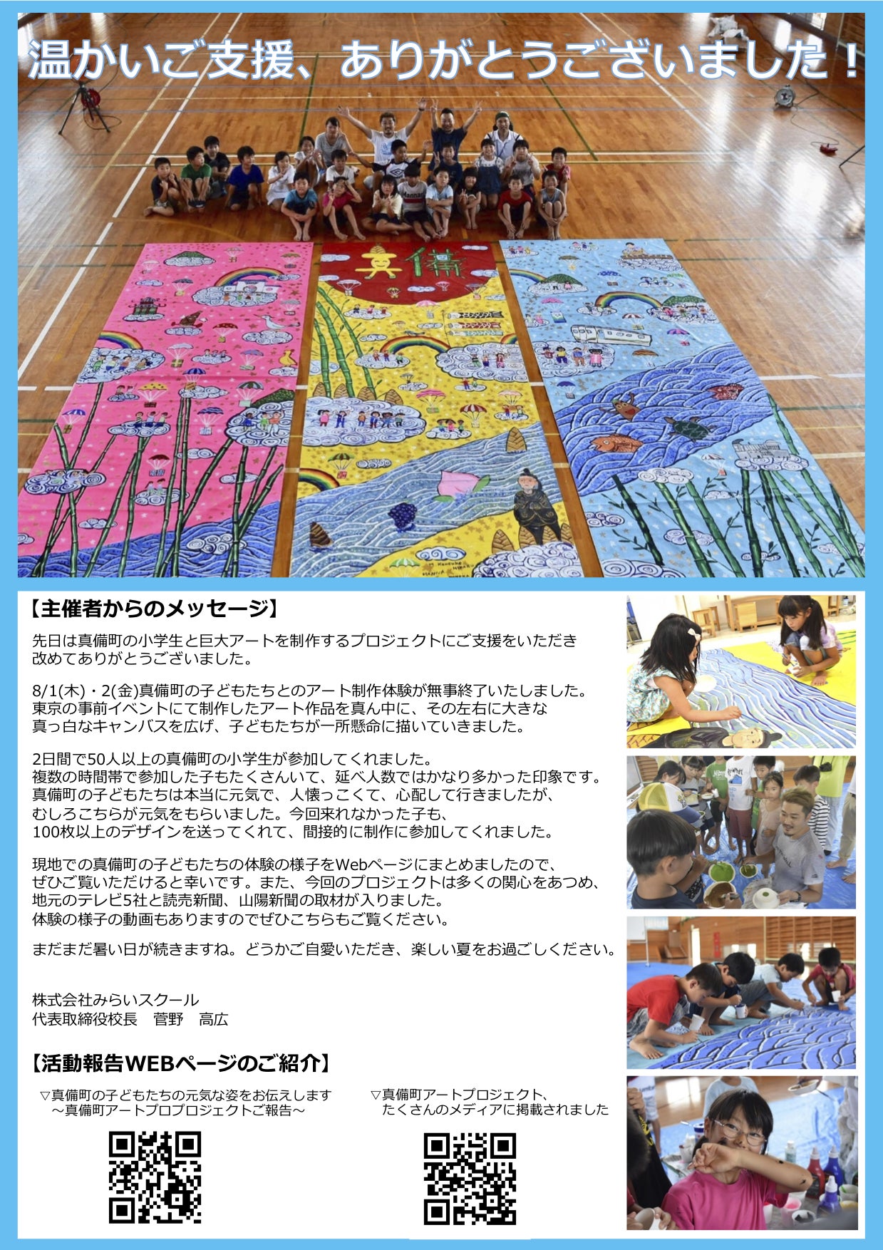 みらいスクール校長の菅野と壁画アーティストのミヤザキさんより、今回のプロジェクトに合流していただいたお礼と、終了後のご報告(製作したアートの写真含む)を差し上げます。