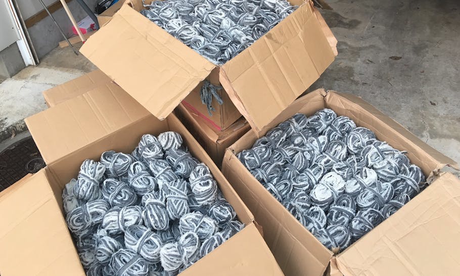 材料のデニムの耳は上の写真で50kg。その倍の量になります。
