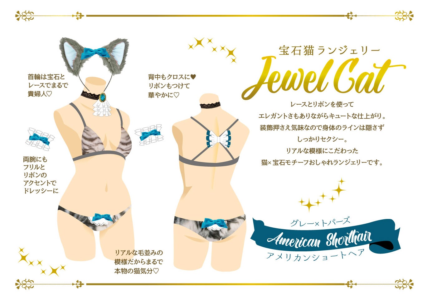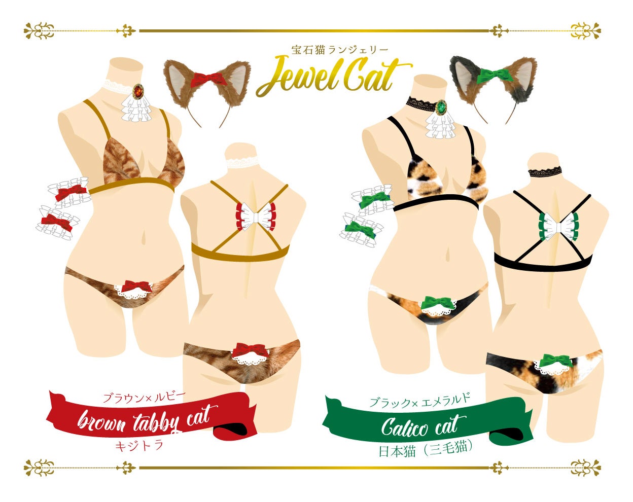 せんきさんも猫が大好きで、いつかは猫モチーフのランジェリーが作れたらいいなという思いと、白猫や黒猫はよく見かけますが、もっと具体的な猫ランジェリーがあったら絶対可愛い!という思いから「宝石猫ランジェリー 」のプロジェクトは始まりました!