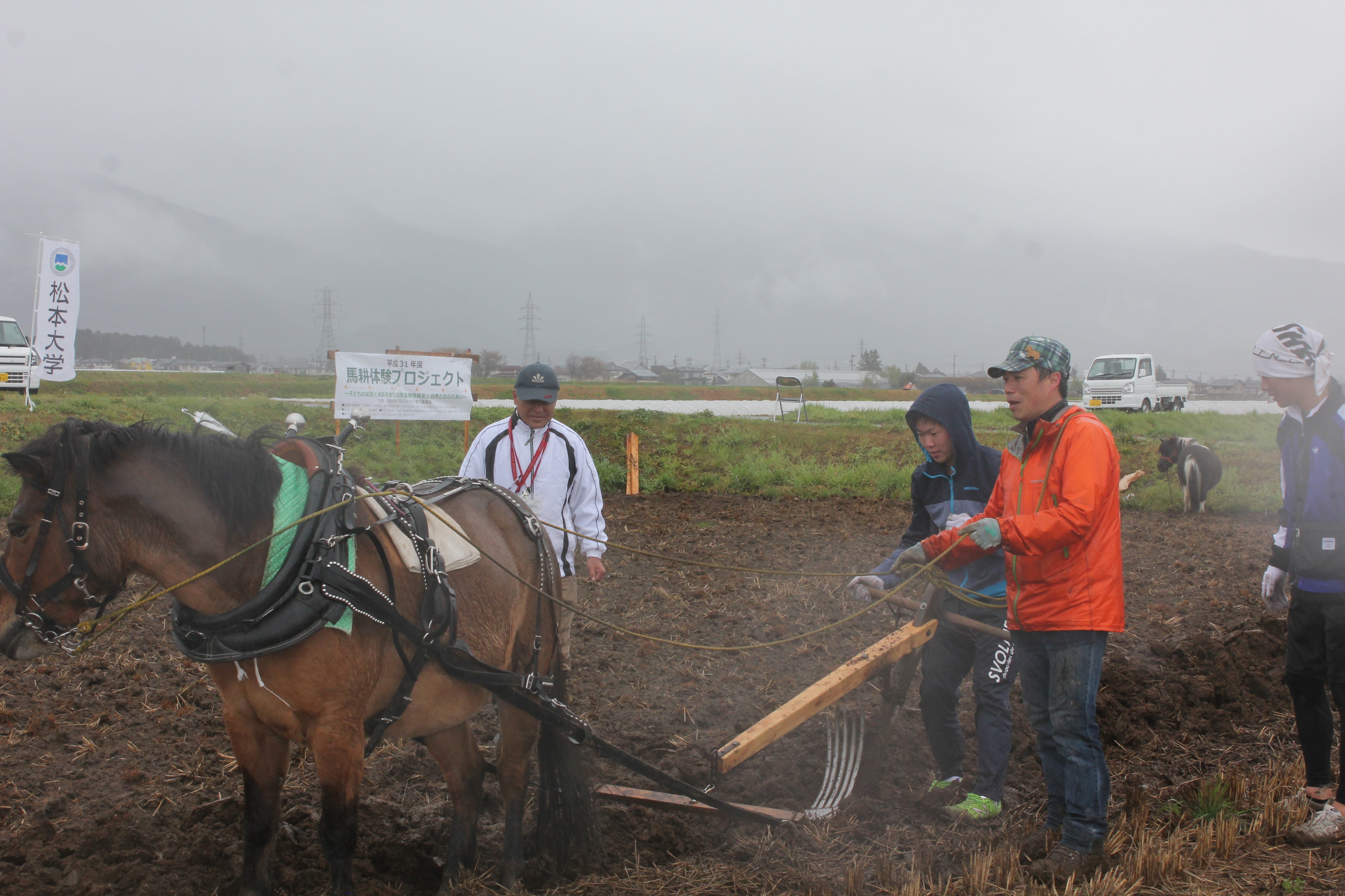 お陰様で無事に馬耕体験プロジェクトを終了することができました。皆様のご協力に感謝申し上げます。当日は、雨、ヒョウが降る天候ではございましたが、何組ものご家族にお出でいただきました。子どもたちには、人気の乗馬を楽しんでいただいたり、マイ箸作りに挑戦していただいたりしました。恒例の美味しい豚汁もご家族で食べていただきました。寒さに震えるような天候でしたので、少しでも温まって頂けたのではないかと思います。また、今年は、マイ箸作りの他に新たな取組として、ヤギ、孔雀等とのふれあいがありました。ポニーを持ってきてくださっった小原さんがご自宅で飼育している動物を持ってきてくださいました。馬耕体験の馬は今年も木曽馬です。中川さんが木曽から持ってきてくださいました。馬耕を体験する場を提供することができ、また、見ていただくこともでき、とても良かったと思います。雨が降り、寒い中、お越しいただいた皆様には心より、感謝申し上げます。また、この場を借りて、この様な子供に楽しみの体験を提供することにご協力くださいました、地域の方々、行政、団体の皆様、協賛をしてくださいました企業等々の皆様、そして運営等にあたってくれた学生諸氏におきましても心より感謝を申し上げます。今後ともご支援のほど、よろしくお願い申し上げます。