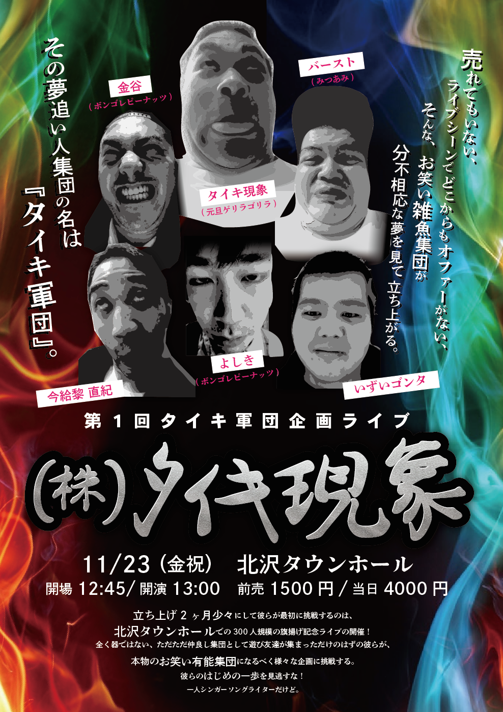 皆さんはじめまして。タイキ軍団です。我々は北九州出身芸人の【タイキ現象】を中心に『お笑い芸人』『シンガーソングライター』『役者』など、エンタメの世界で生きていくことを目指すも、各界で底辺の雑魚扱いをされ、それでも何とか爪痕を残そうとする者が集まった軍団です。