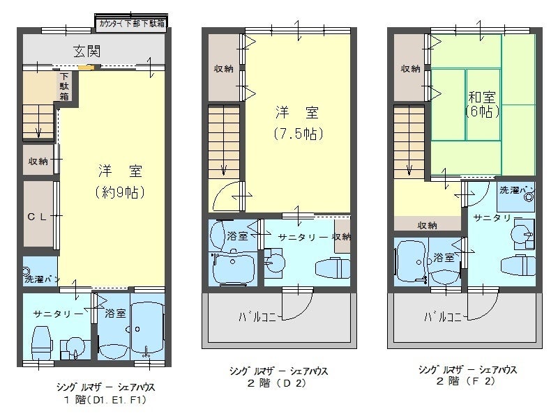 (1階は同じ間取りが3部屋(3世帯分)、2階は違うタイプのお部屋が2部屋(2世帯分))