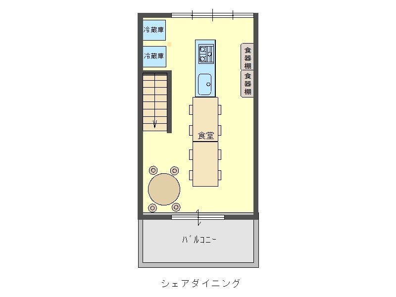 (2階の真ん中に、共有のダイニングが1つあります)