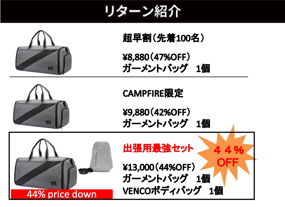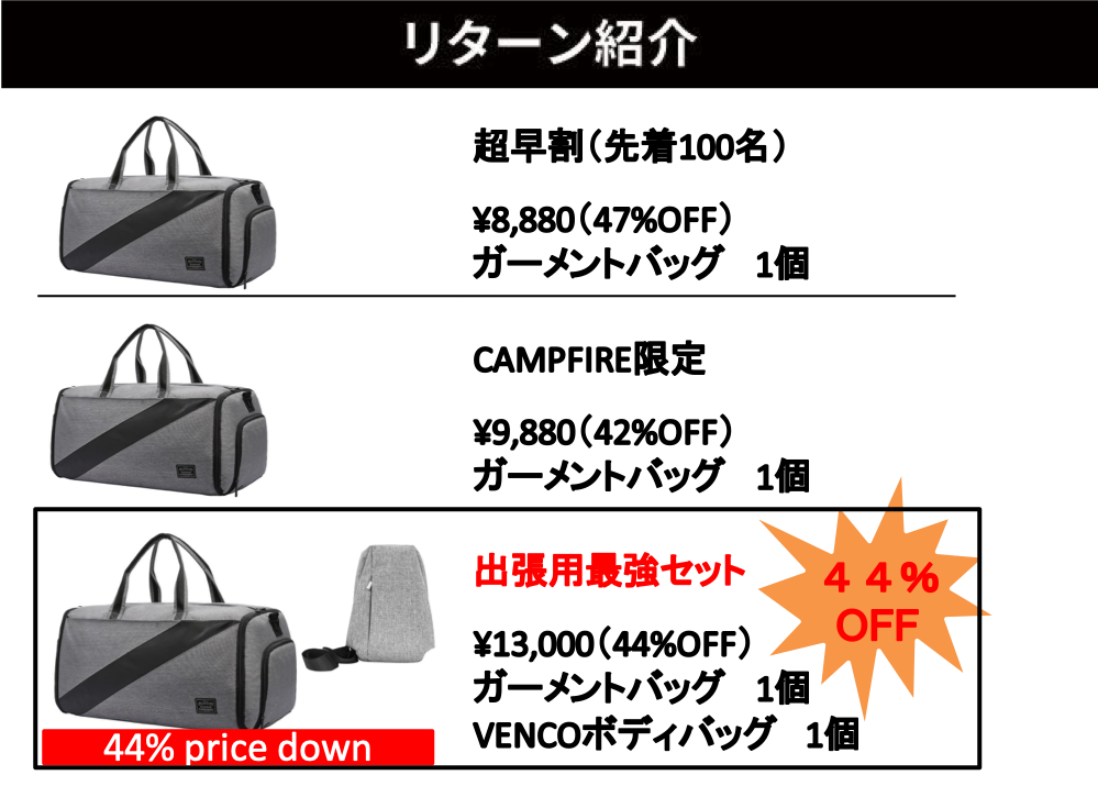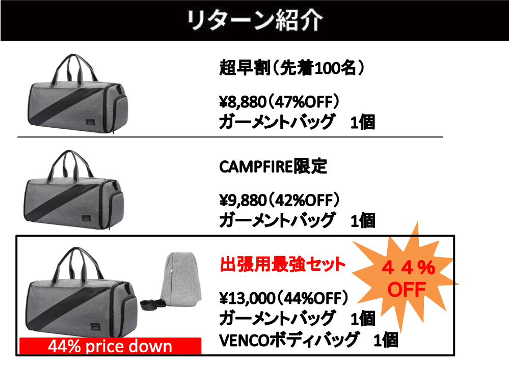そんなビジネスマンの悩みを解決するために製作したのが「180°全開!スーツにシワなし!シューズも収納!51ℓ超多機能ガーメントバッグ!」。超多機能で収納力抜群なバッグです!これさえあれば、出張も、仕事前のジムも、快適になるでしょう!あなたの生活に少しでもお役に立てれば嬉しいです!ぜひともご支援よろしくお願いします。