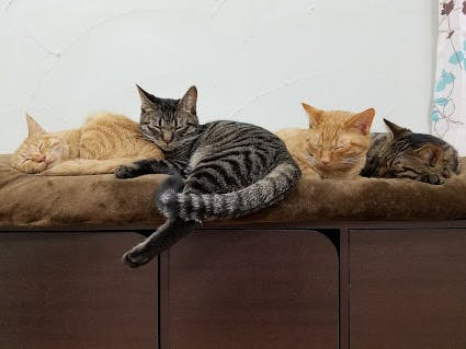 保護猫ハウスのなかでぬくぬく寝る猫たち。