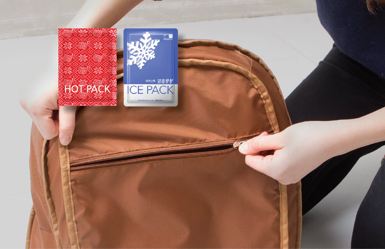 *ご注意: カイロが熱すぎたり、アイスパックが冷たすぎる場合、布でくるんで調整し、お使いください