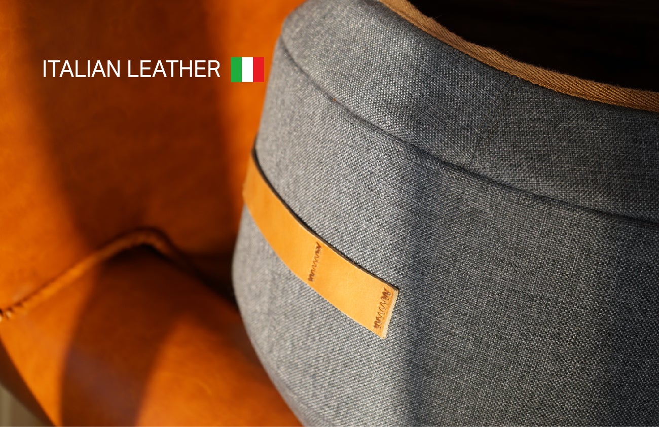 バッグの上段と下段、持ち手の部分には丈夫で柔らかいイタリア製の一枚革を使用しました。天然皮革は傷や使用にともなう色褪せによって独特の味わいが出てきます。