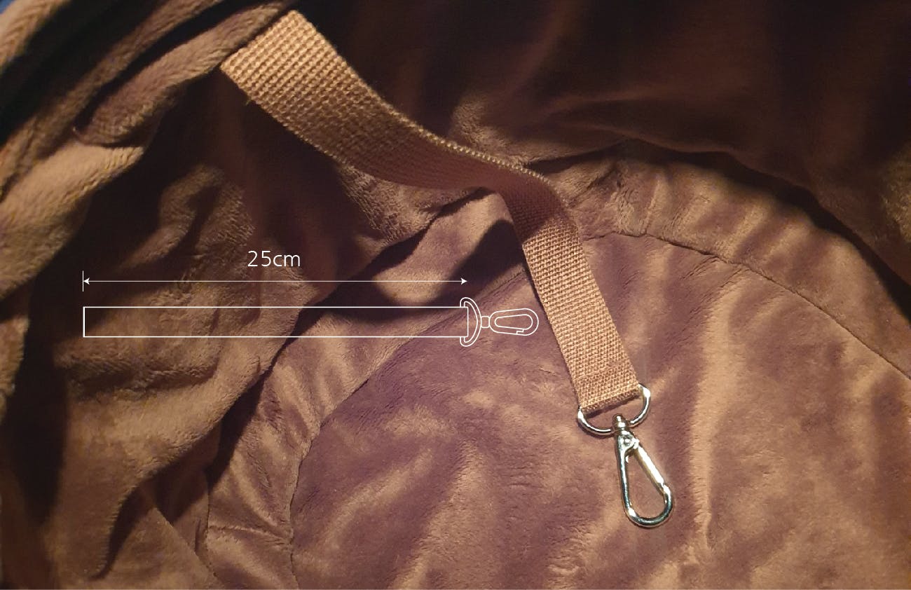 ペットの脱走を防ぐハーネス連結リングです。連結ベルトは25㎝と十分な長さがあり、使わない時は裏地と表地の間に折り畳んで収納可能です。