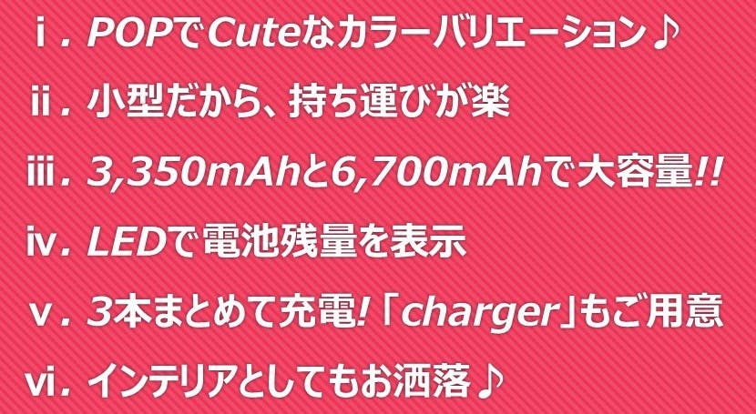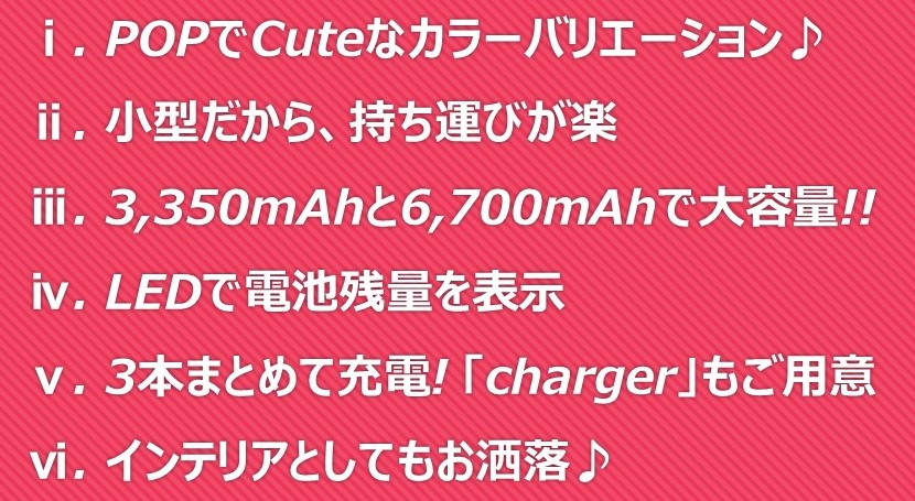 容量は「3,350mAh」と「6,700mAh」の2種類があります。小旅行なら1本で充分!!