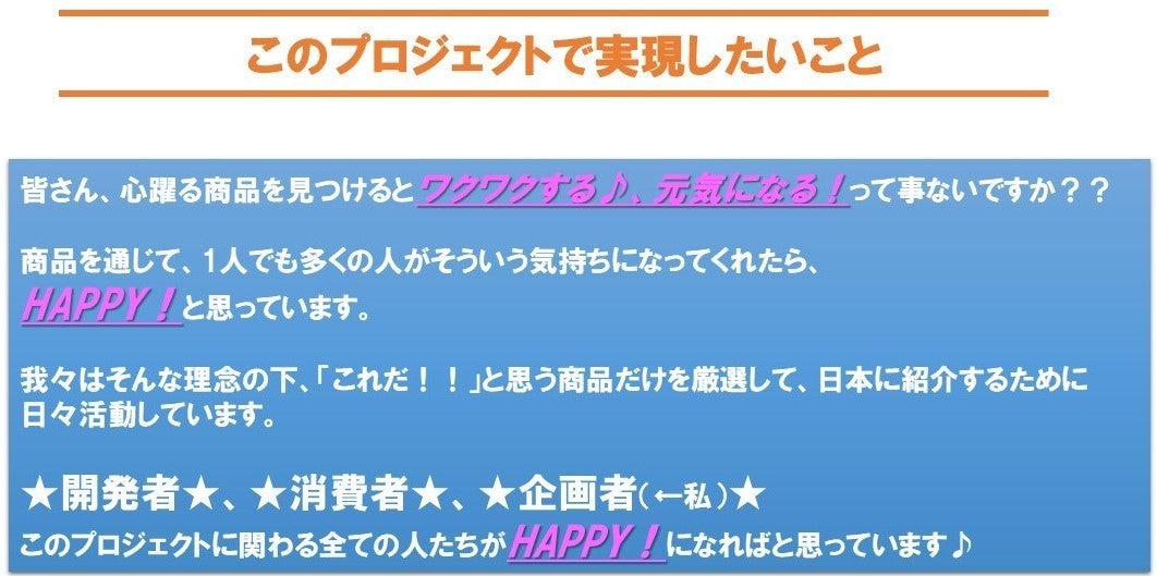 現在社会はモノが溢れている、モノが過剰にある世界だからこそ、日本未発売であり、世界中のスタートアップ企業が開発した、埋もれてしまっている宝物≪良いモノ≫を発掘して、日本に広めたいと思っています。