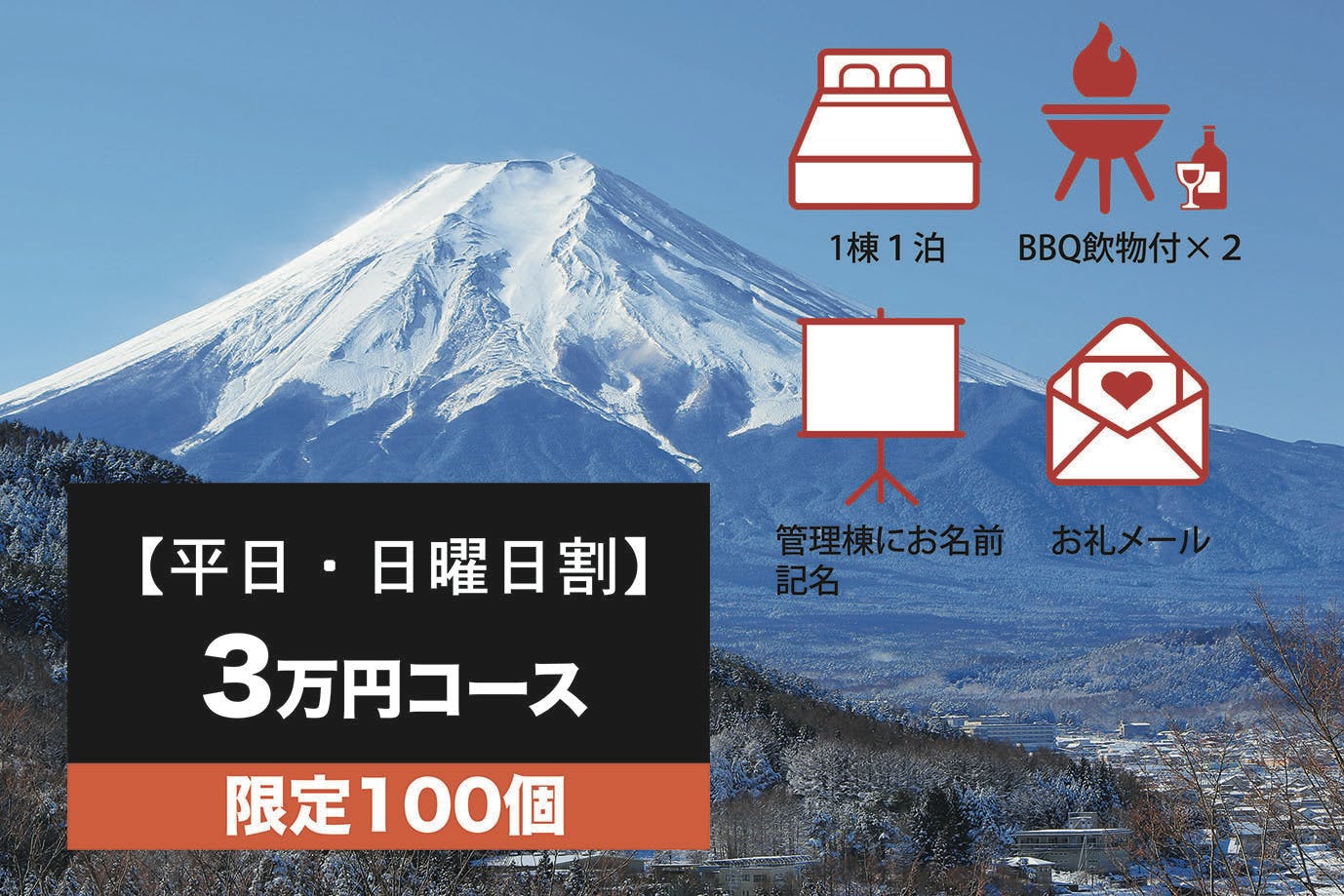 ・3棟独り占め【土曜・祝前日・トップシーズン割】宿泊券 BBQ2人前 飲物付き