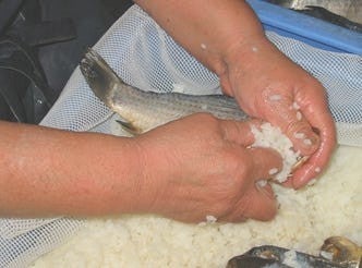 鮒ずしは、卵を持ったニゴロブナのメスを塩漬けにし、ごはんと交互に重ねて、数カ月間漬けこみ、発酵させて作ります。