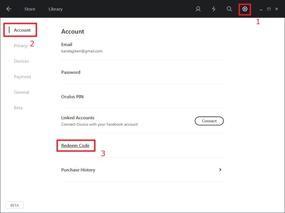 ウィンドウが開くので、Oculusキー(Redeem Code)を入力してください。(下図)