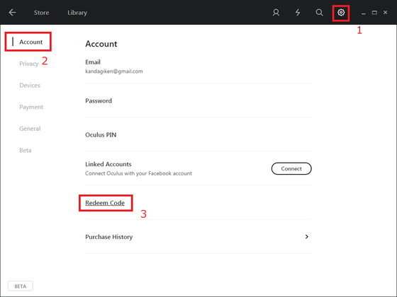 Oculusキーの使い方: Oculus Homeのアプリを開き、右上のメニューの歯車アイコン -> Account -> Redeem Code を選択します。(下図) ウィンドウが開くので、Oculusキー(Redeem Code)を入力してください。(下図) ●VR戦艦大和のヒント・内火艇に乗船したら、船室の中に水兵さんがいるので前に立って話しかけてください。・オートセーブをしているので中断できます。再開するときはスタート画面の「途中から」を選択してください。 今後ともご声援よろしくお願いいたします。------------------------------------------------------------西野元章(仁志野六八) 株式会社神田技研
