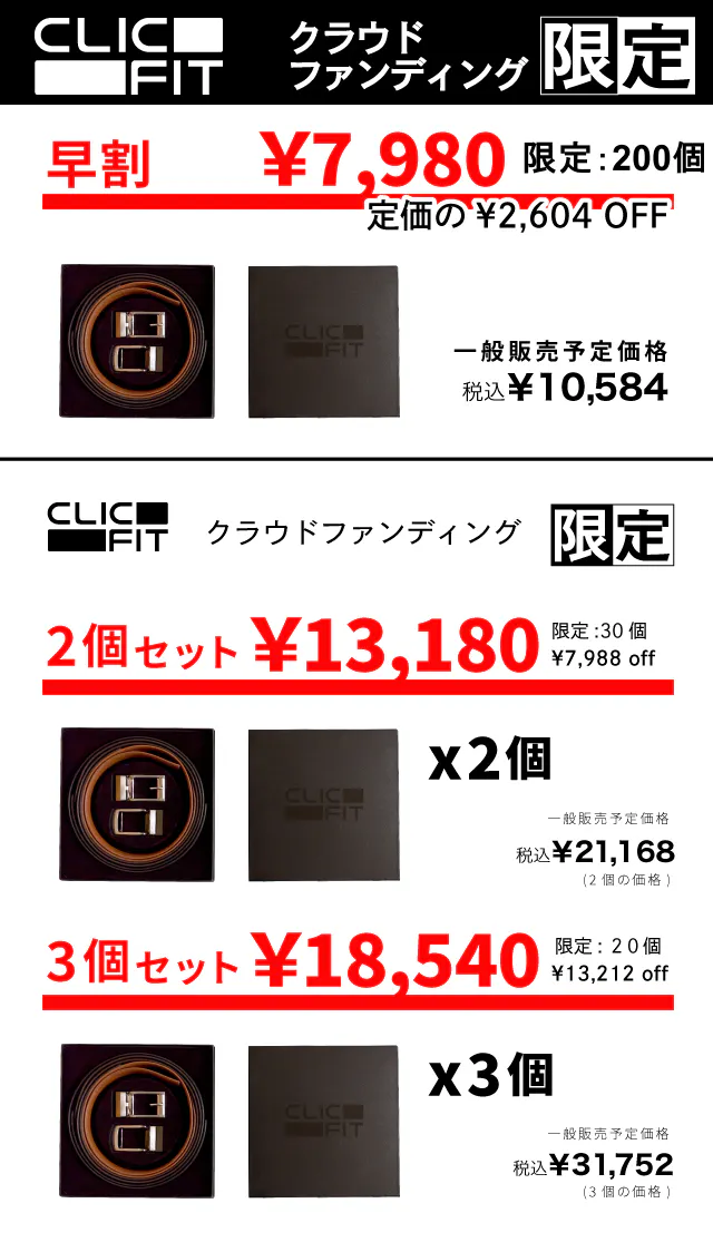 【CLIC-FIT】は革新的なラチェットシステムを搭載したベルトです。自由なサイズ調整とどんなスタイルにも合わせられるセット内容に注目が集まり米国クラウドファンディングKickstarterにおいても多くの支援を集めました!