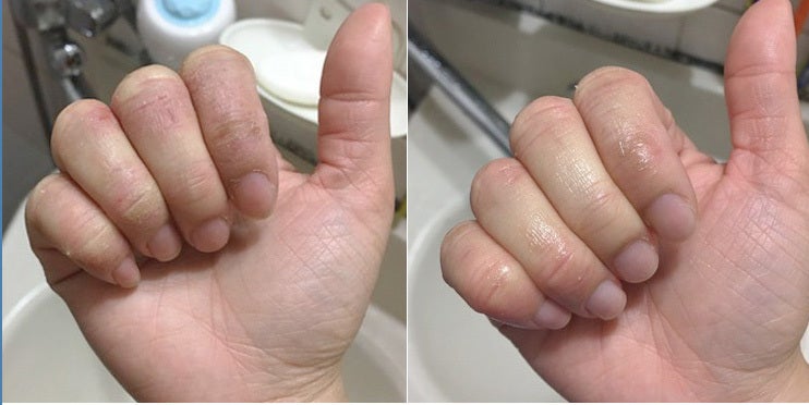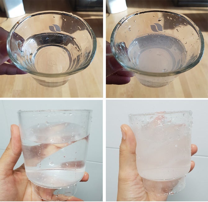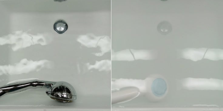 "一般のシャワーヘッドとM2マイクロバブルシャワーヘッドと比較した写真です。 実際に水に触れて手をこすったとき確かに違いがあります。軟水器と同様に水が甘いと感じます。"