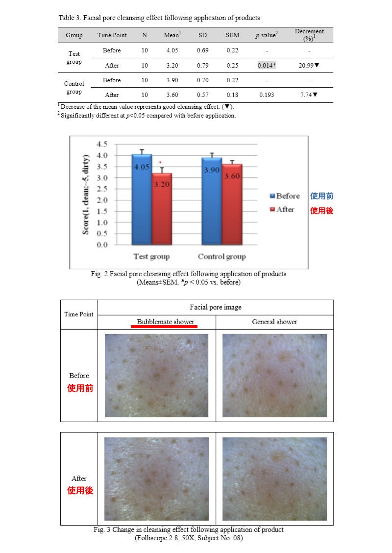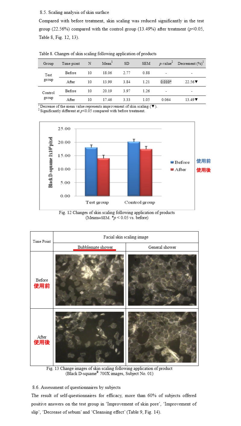 M2マイクロバブルシャワーヘッドの使用前と比較して使用直後、20%以上の角質除去率を見せる(ダーマプロ皮膚科学研究所)