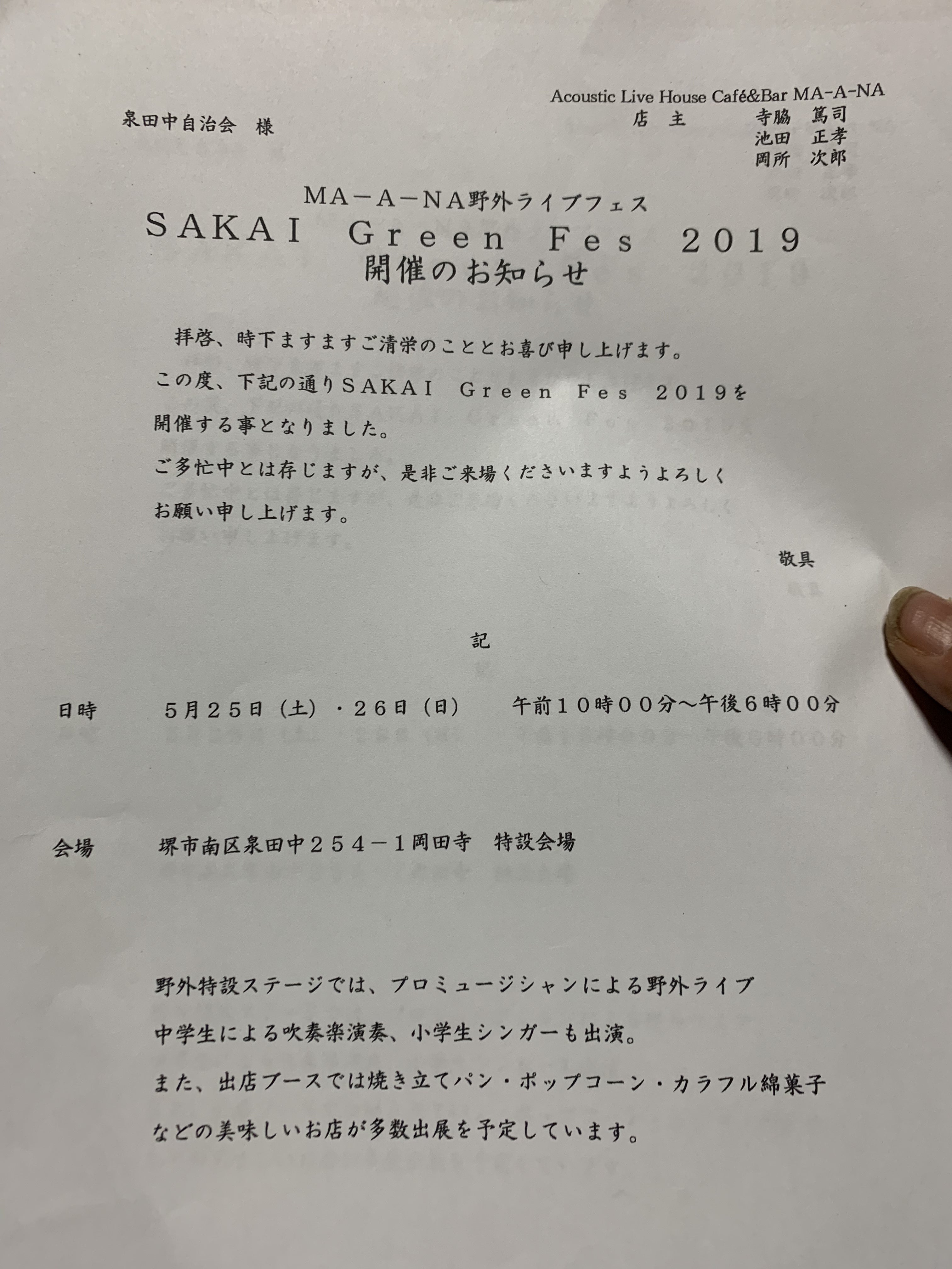 Acoustic Live House Cafe&Bar MA-A-NAはじめまして!大阪府堺市南区泉田中でAcoustic Live House Cafe & Bar MA-A-NAを営んでます。店主の寺脇です。堺で生まれ堺で育ち先祖代々堺の人間です。私は人が笑っている姿を見るのが好きです!人が楽しんでいる姿を見るのが好きです!人が喜んでいる姿を見るのが好きです!私はこの裏山から始まるイベントを「SAKAI Green Fes」と称して開催し、皆さんの笑顔で楽しみ喜んでいる姿を見たいと思っています。また皆さんが笑顔で楽しみ喜んでいただける企画だと考えています。よろしくお願いします!
