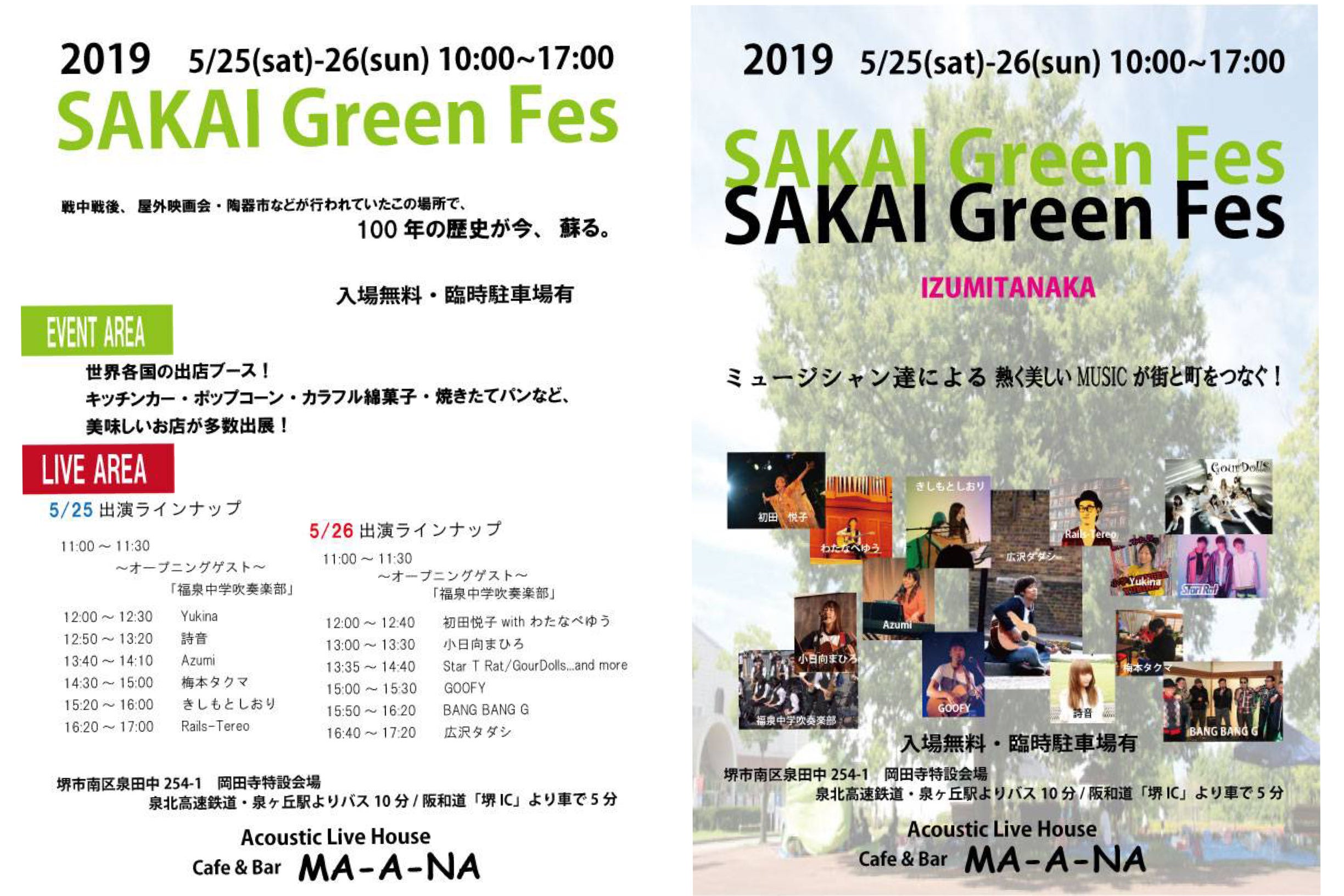 会場入り口堺市南区泉田中という土地は、上神谷地区と呼ばれ良く言えば自然がいっぱい!堺市屈指の田舎です。隣接する地域に泉北ニュータウンがあります。この両地域が堺市南区の大半を占めています。この「SAKAI Green Fes」を開催し継続する事で、上神谷地域と泉北ニュータウン地域が共に協力し、堺市南区を盛り上げ、その先には堺市を盛り上げ、そして全国に知られる大イベントに成長する事によって、この地域の活性化に繋げたいと思っています。