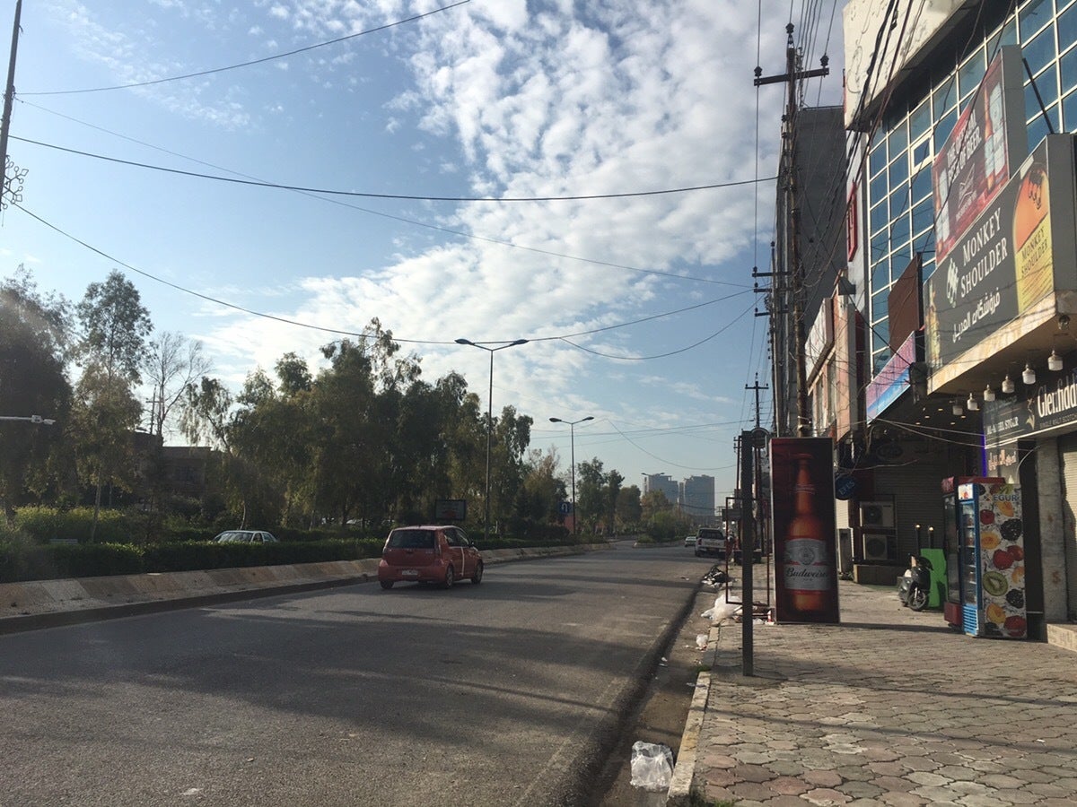 写真、バドワイザーの広告があるんじゃないですか。昨日、僕が街に入った時に驚いたんですが、イスラム圏では結構珍しくて。特にイラクとかほとんどアルコールなど見かけないだろうなと思っていたんですが、アルビルの一角にイラクでもめずらしいキリスト教の人たちが住む街があってそこではアルコールも売っている。お店にいくと、ロシアのお酒やイギリスのスコッチなどウィスキー、そしてビールは日本のやつは入っていないんだけど、アメリカや韓国のビールなど入っていた(日本、がんばれよw)。