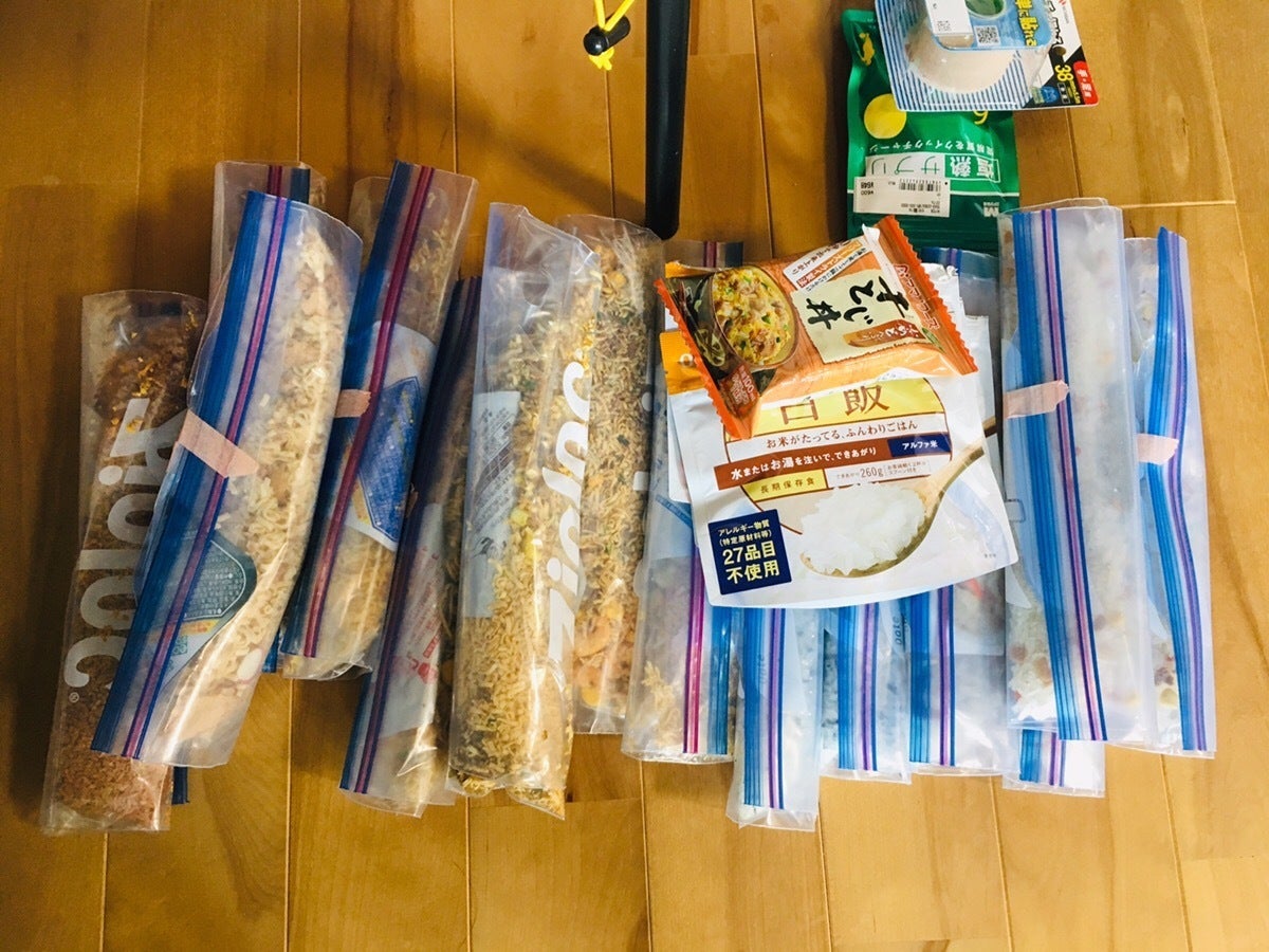 上方写真ご覧ください。食料がたくさん!真ん中の正方形のパックはラーメンだそうです。こんな形のラーメンあるのですね。エネルギーチャージのドリンクもありますね。あとはシュラフ、ボンベなどキャンプグッズも。