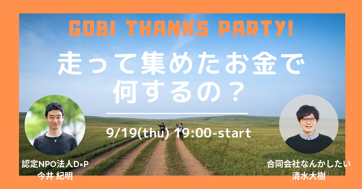 \GOBI THANKS PARTY!走って集めたお金で何するの?/ こんにちは!D×Pの熊井です。 6月に全額チャリティのクラウドファンディングを開始してから2ヶ月たちました。 8月には今井がゴビ砂漠250㎞マラソンの大会に挑戦! 持病にも悩まされましたが、無事に完走することができました。 ご支援してくださったみなさま、本当にありがとうございました。 ゴビ砂漠を走って集めた約1,000万円で、D×Pは実際、どんなことをするのか? どんな取り組みにチャレンジするのか? サンクスパーティとして250kmの完走をお祝いしつつ、これからのチャレンジについてをお話したいと思います! モデレーターに「合同会社なんかしたい」の清水大樹さんをお迎えして、ゴビ砂漠でのこと、クラウドファンディングのこと、そしてこれからのチャレンジについて語り合っていきます。 クラウドファンディングに支援し、サンクスパーティのリターンを購入いただいた方は無料でご参加いただけます。 支援はしなかったけど気になるという人も、ぜひ遊びにいらしてください! ------------------------------------------------------------------------------- ■日時: 2019年9月19日(木) 開場18:45/ 開始19:00/ 閉場21:45 ■会場: NPO法人D×P 天満橋事務所1F 大阪市中央区天満橋京橋1-27 ファラン天満橋 (京阪線・大阪市営地下鉄 天満橋駅から徒歩2分) ■参加費: ・リターン購入のかたは無料 ・お連れ様はチケット代2000円(軽食付) ■チケットを購入する ※リターン購入のかたも必ずチケットをご購入ください。 ■タイムライン: 19:00-19:10 認定NPO法人D×P説明 19:10-19:20 ゴビ砂漠報告 19:20-19:50 走って集めたお金でなにするの?トーク 19:50-20:05 質疑応答 20:05-20:10 クロージング 20:10-20:50 フリータイム 21:00 終了 ------------------------------------------------------------------------------- ■登壇者:清水大樹 | 合同会社なんかしたい代表 「大学生のコミュニティスペースagora」 「学んだ先が見える個別指導塾まなびのさき」 「宿題も安心の学童教室あそびのば」を開校。 この3つの事業を同じ場所で運営し、小学1年生〜大学4年生までが世代を超えて、自分の考えや創造したい社会を語り合う学習環境を京都中心に展開。自分の人生に主体的に、社会に当事者意識をもてる環境づくりを。 学生の選択肢の幅を広げる各種イベントや教育プログラムなど様々なアプローチで、セカイ(世界・社会)をチカク(近く・知覚)することをミッションとし、1人でも多くの人が明日も生きたいと思える社会づくりを目指している。