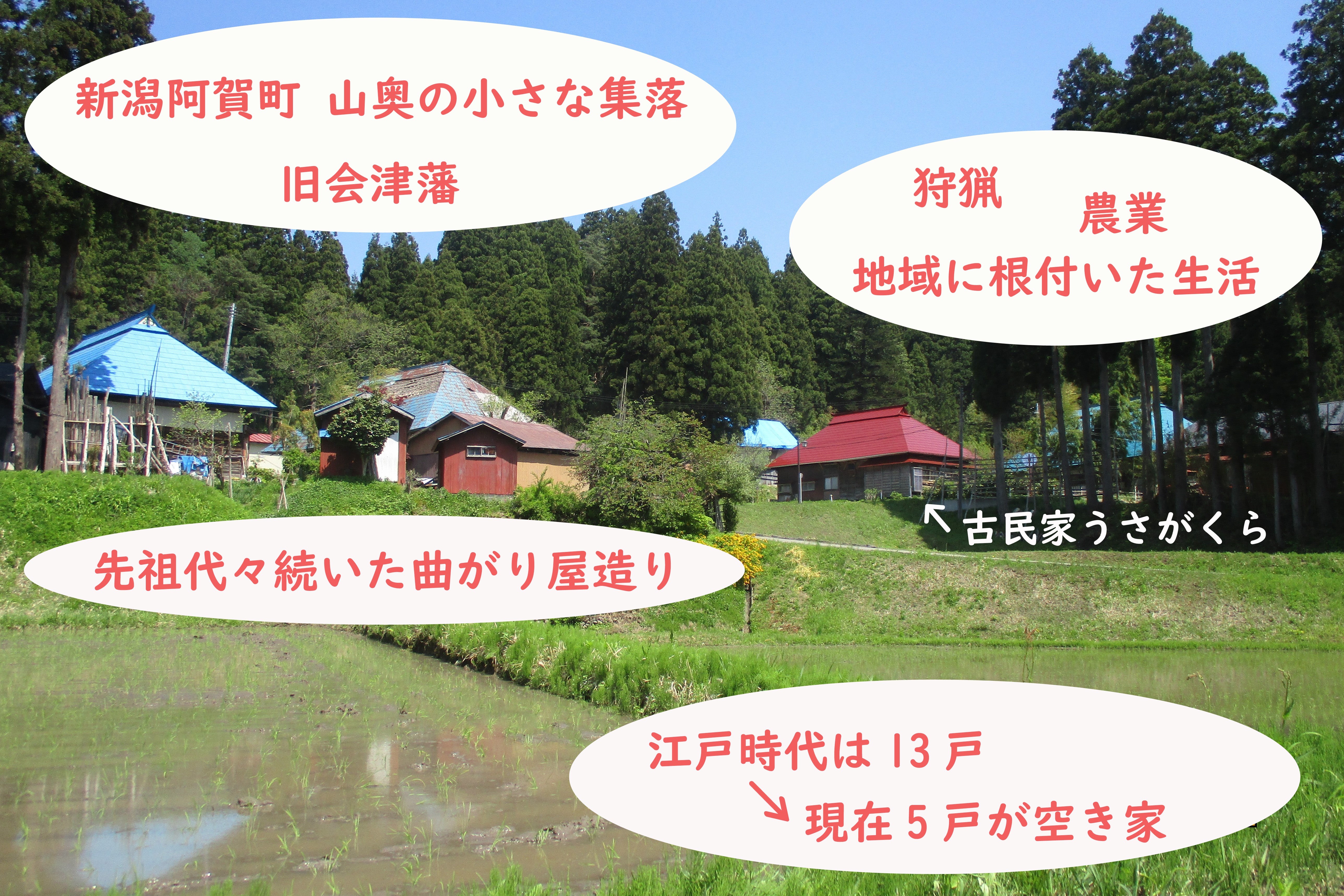私たちの父は、新潟県津川町(現阿賀町)の山奥の小さな集落、倉ノ平に生まれました。そこは、福島県との県境近くで旧会津藩の歴史がある地域です。父の家は、代々、田畑を耕し、熊などの猟をし、炭焼きをして、地に根差した生き方をしてきました。しかし現在、父の生家は空き家になっています。江戸時代以降、30年程前までは、13戸の家があった集落ですが、現在5戸が空き家です。築150年のこの家を、他の人にも見て頂き、この家や、この地域の暮らしを楽しんでもらいたいと思いました。そこで、気軽に使っていただける「古民家ちょい貸し」と、体験型の「地域発信のんびりイベント」ができる家に再生したいと考えました。