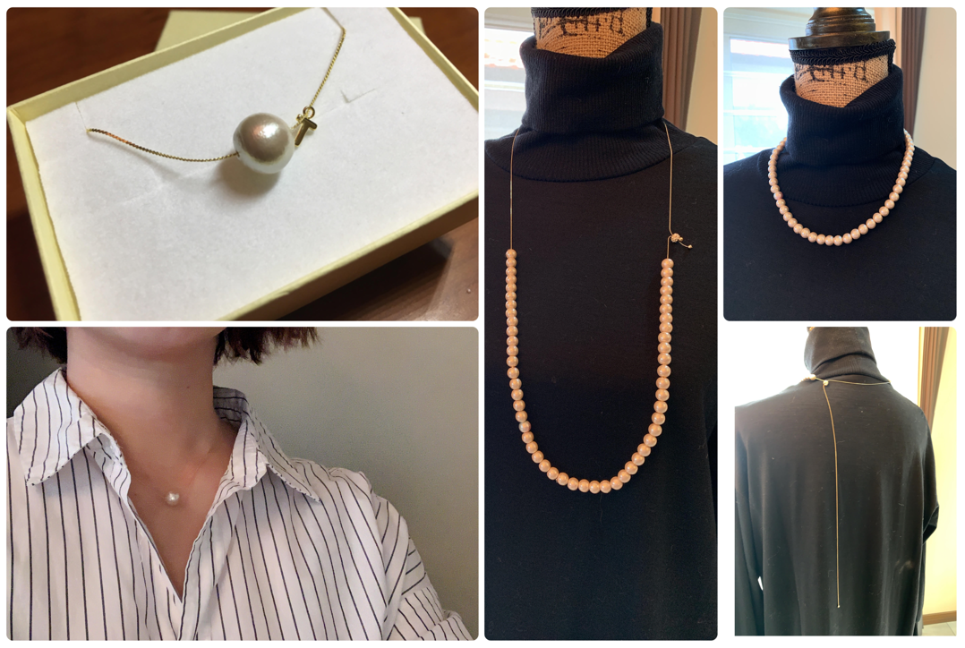 コットンパール10mm使用。チェーン部分は40cm。ネックレスの金属部分は、アレルギー対応可能です。8mmパールロングネックレスは、パール部分40cm(可動長さ40~85cm※以下写真参考)の10セットの限定発売!