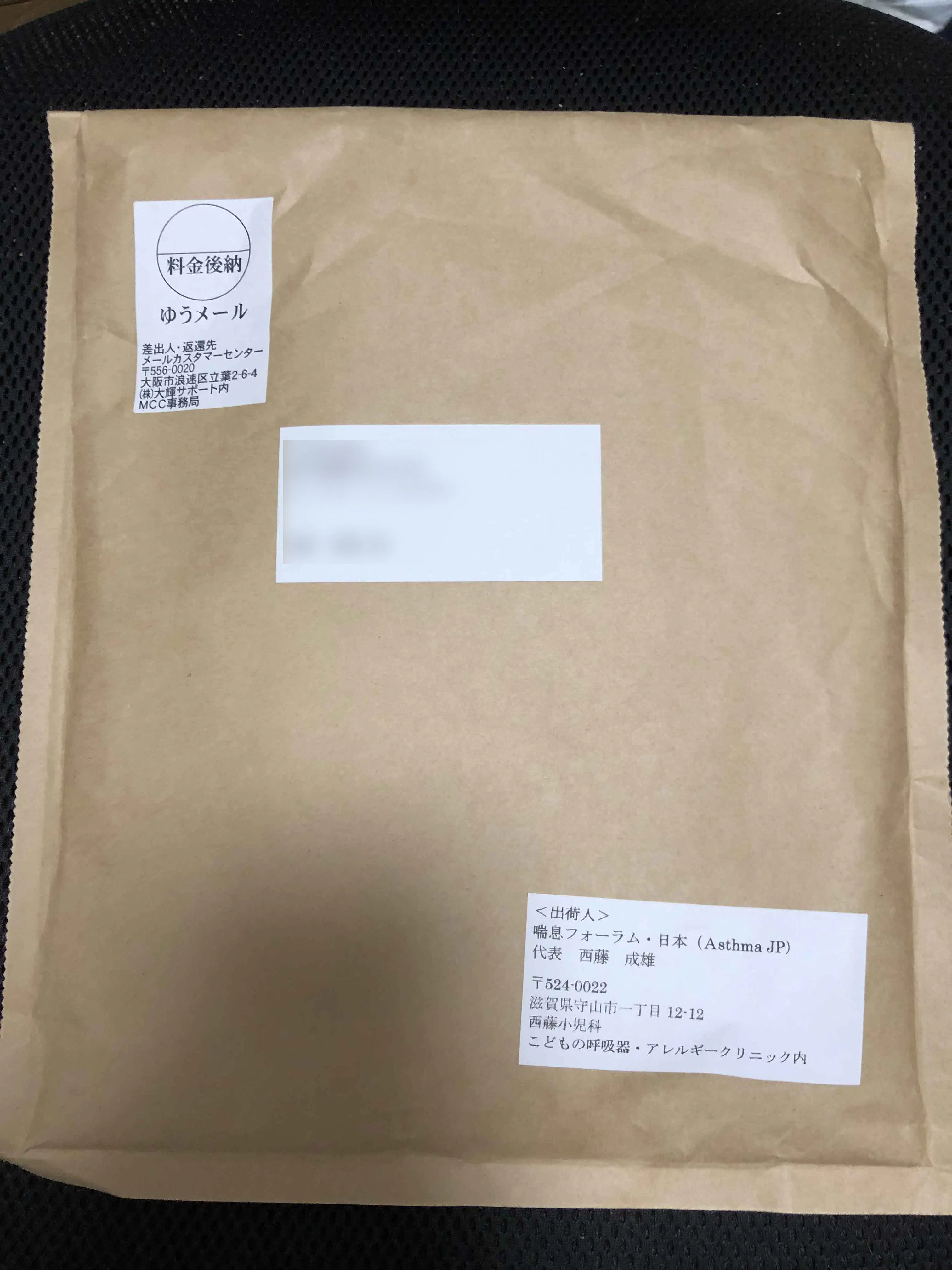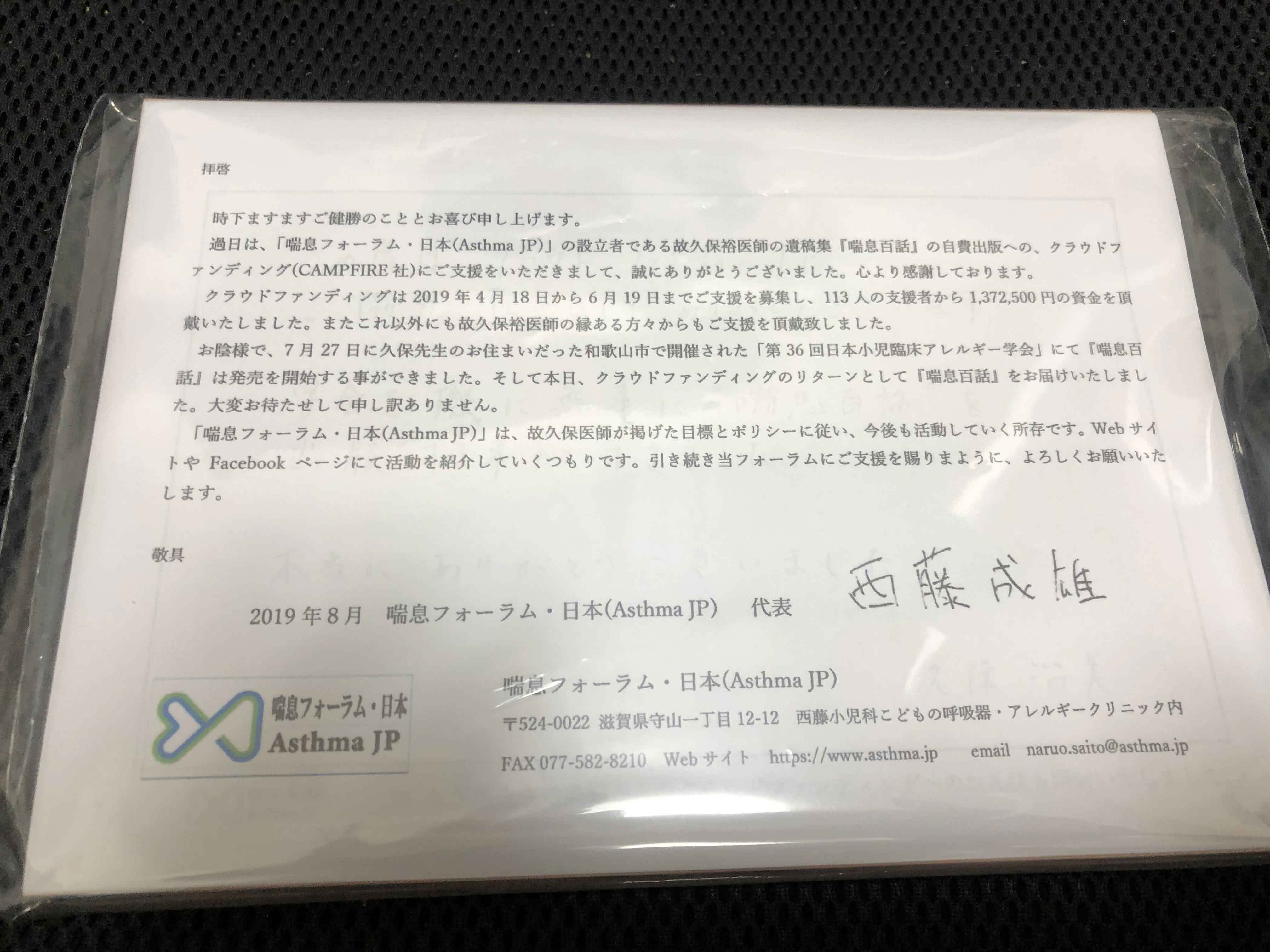 「喘息フォーラム・日本」からのお礼状