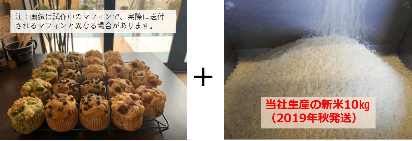 (試作品のマフィンは2019年7月の中~下旬、完成品を2019年8月の中~下旬にお送りする予定です。アンケートを添えさせていただきますので、是非ご回答いただき、完成品の美味しさ向上にご協力をお願いいたします。なお、お米は2019年10月~12月に順次発送いたします。)