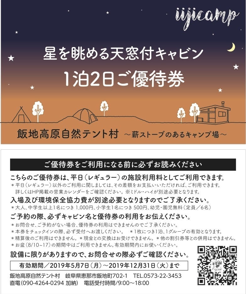 飯地高原自然テント村ご利用優待券(2019年末日まで要予約、フェスティバル当日はご利用不可)×1