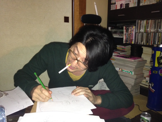 どうも、デブまっしぐら、大塚ニューコーポです。われわれは今日一日を掛けて、写真集に掲載するポーズ案を確定する作業を行なっております。大塚ニューコーポの面々は、日頃は世をしのぶ仮の姿で世間と何とかよちよち渡り合うぼんやりサラリーマン/ウーマンの巣窟ですので、こうやって土日に作業するしかないんですね。しょうがないですね。というわけで、写真のヒゲでメガネの大塚ニューコーポメンバーの一人で、今回のポーズ集にかかわるデザインワークスを一手に引き受けている「新潟が生んだ変態米騒動」ことたなか贋作がせっせとポーズ案のラフを描いております。(写真に写りこんでいる発泡酒のようなものは発泡酒のように見えてそのものずばり、発泡酒です。昼からすいません)みなさんにファットでオイリーでコレステローリーなヌルッヌル・テカッテカのポーズ集をお届けできるよう、今日一日がんばります!また、ラフが描き終わった頃にご報告させていただきますね!