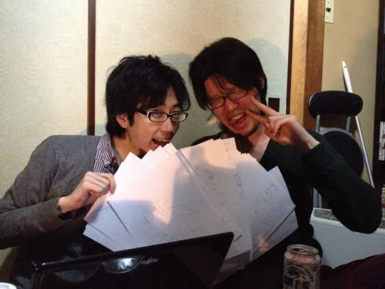 みなさんこんばんは。春空の土曜日なのに雨のちらつくこの夜長、いかがお過ごしでしょうか、大塚ニューコーポです。本日、一日がかりで作成作業中だったデブポーズ集のポーズ案のラフスケッチ、全ページ分完成いたしました!デザインを司る「高円寺在住のスキニーエロガッパ」ことたなか贋作(写真右)も、出来上がったラフに写真のごとくご満悦です。ここからは撮影に向けてロケーション・ハンティングや小道具の準備、ぎたろー君の体調管理(という名の餌付)などなど細かい詰めの作業を行なっていきます。その模様は随時ご報告できると思いますので、どうぞよろしくお願いします!