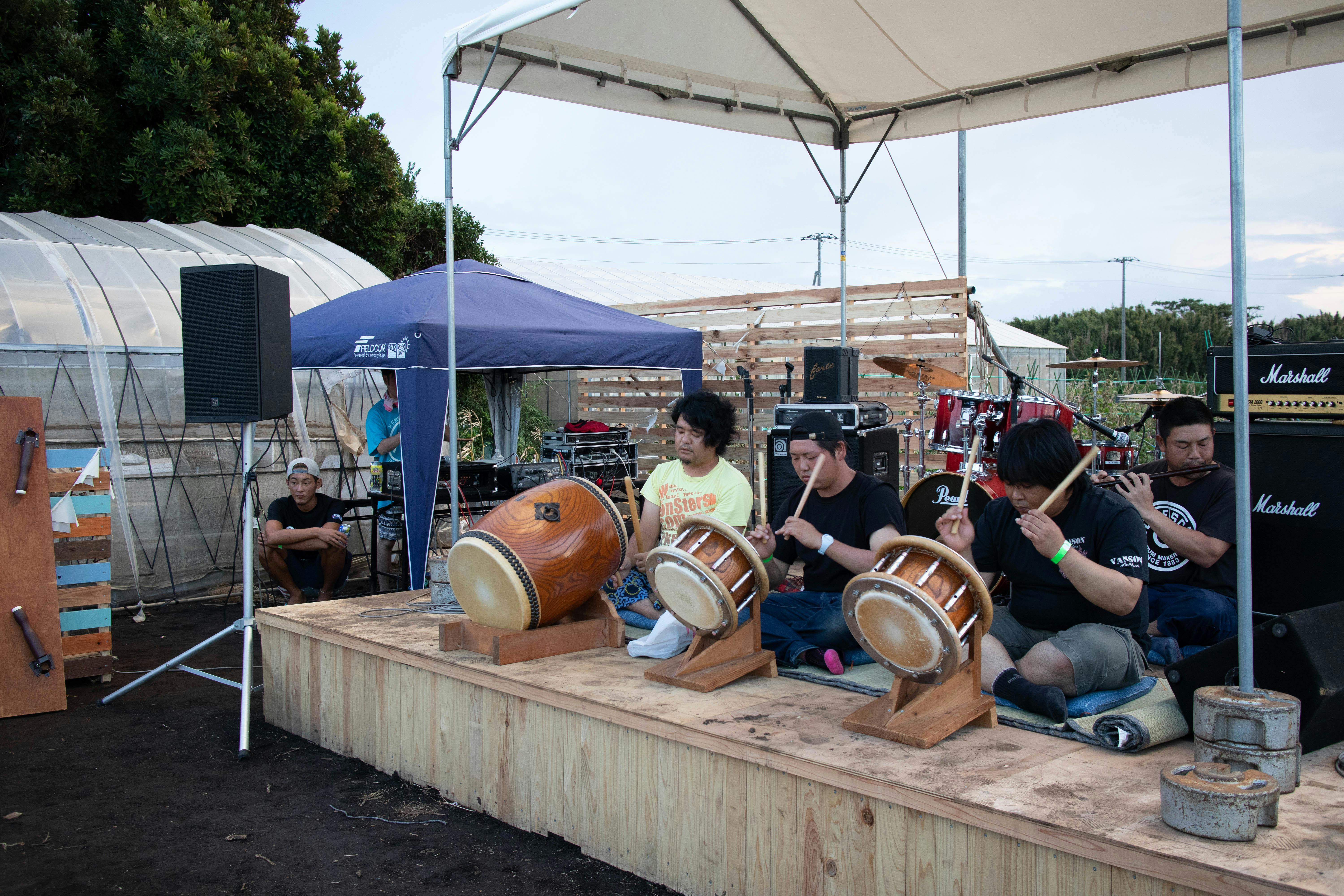 音楽 地元の文化、祭囃子を[宮川町囃子方]、[仲崎区囃子方]、[い組囃子方]など三浦市内でも種類の異なる祭囃子を農場の特 設ステージにて披露しました。また、日本国内、海外からのDJやバンドによる演奏もあり、普段の三浦では味わえない 生の音楽を聞き、たくさんの方が楽しんでいました。