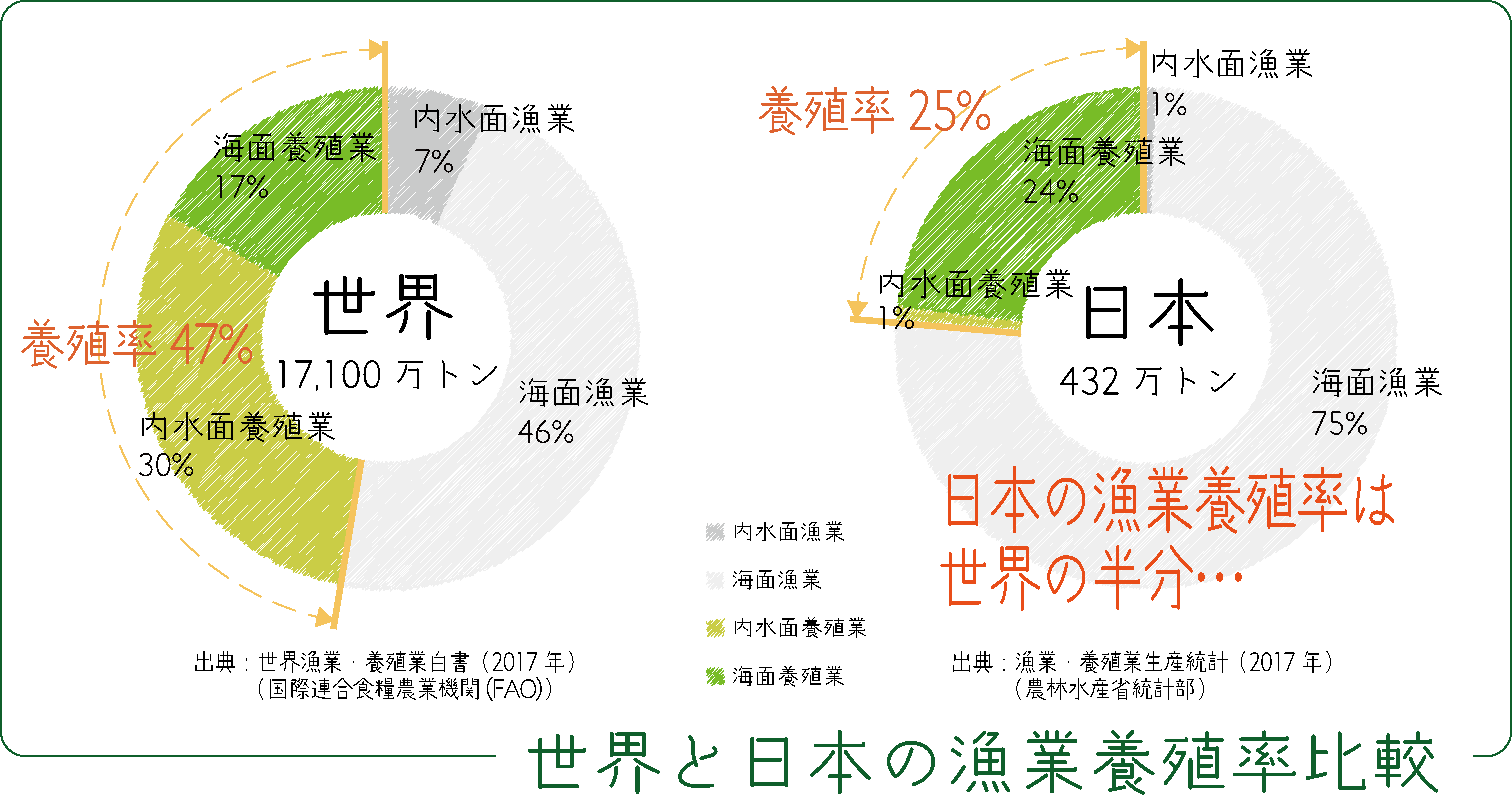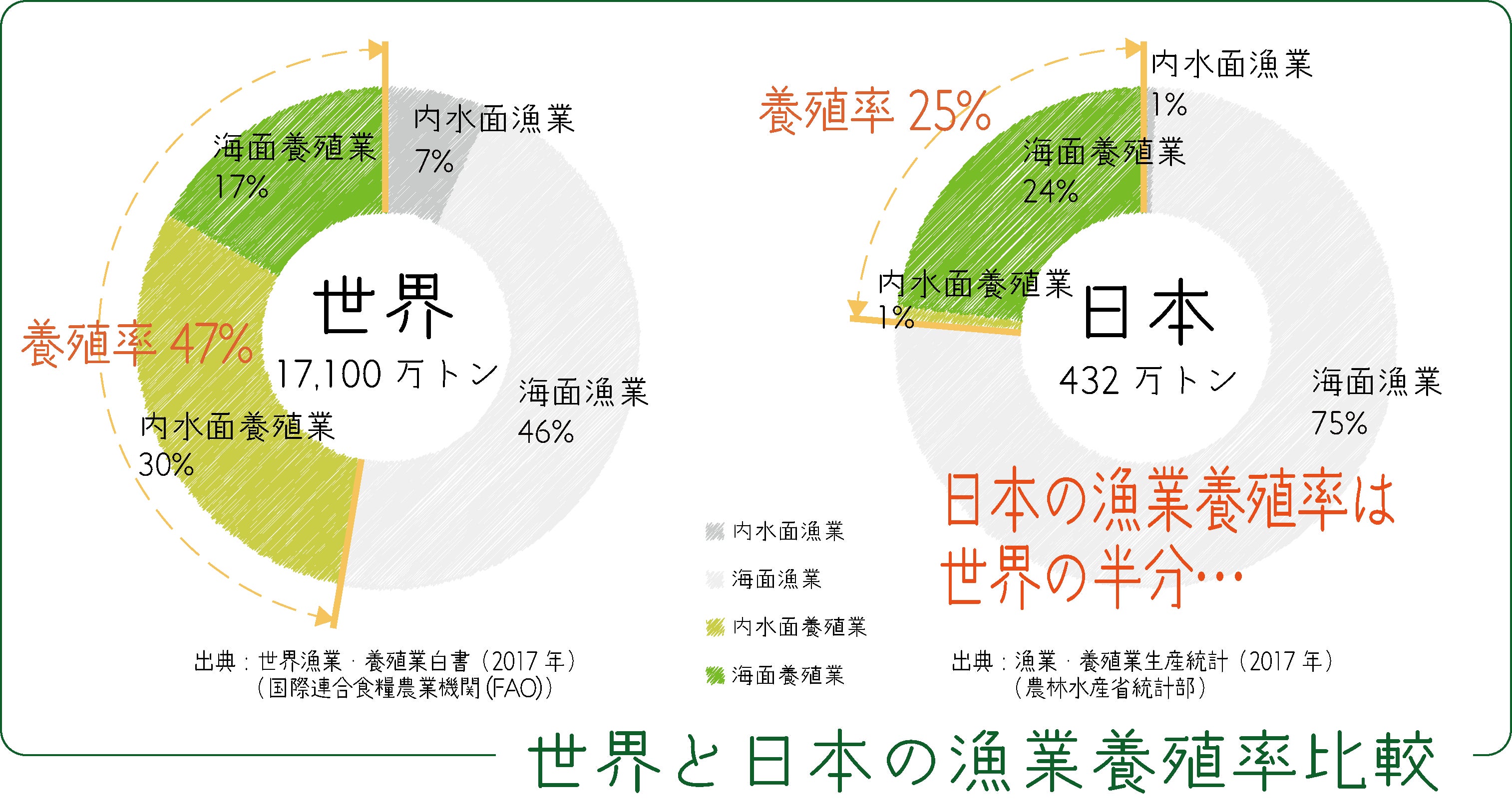 日本の漁業養殖率は海外平均に比べて極めて低く、漁業自体が安定的な需給環境に置かれていません。