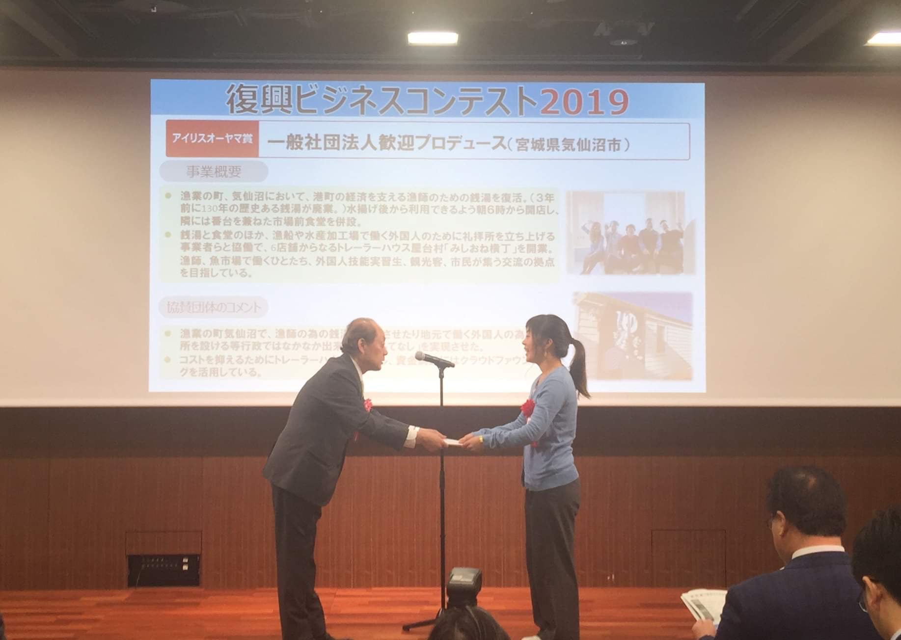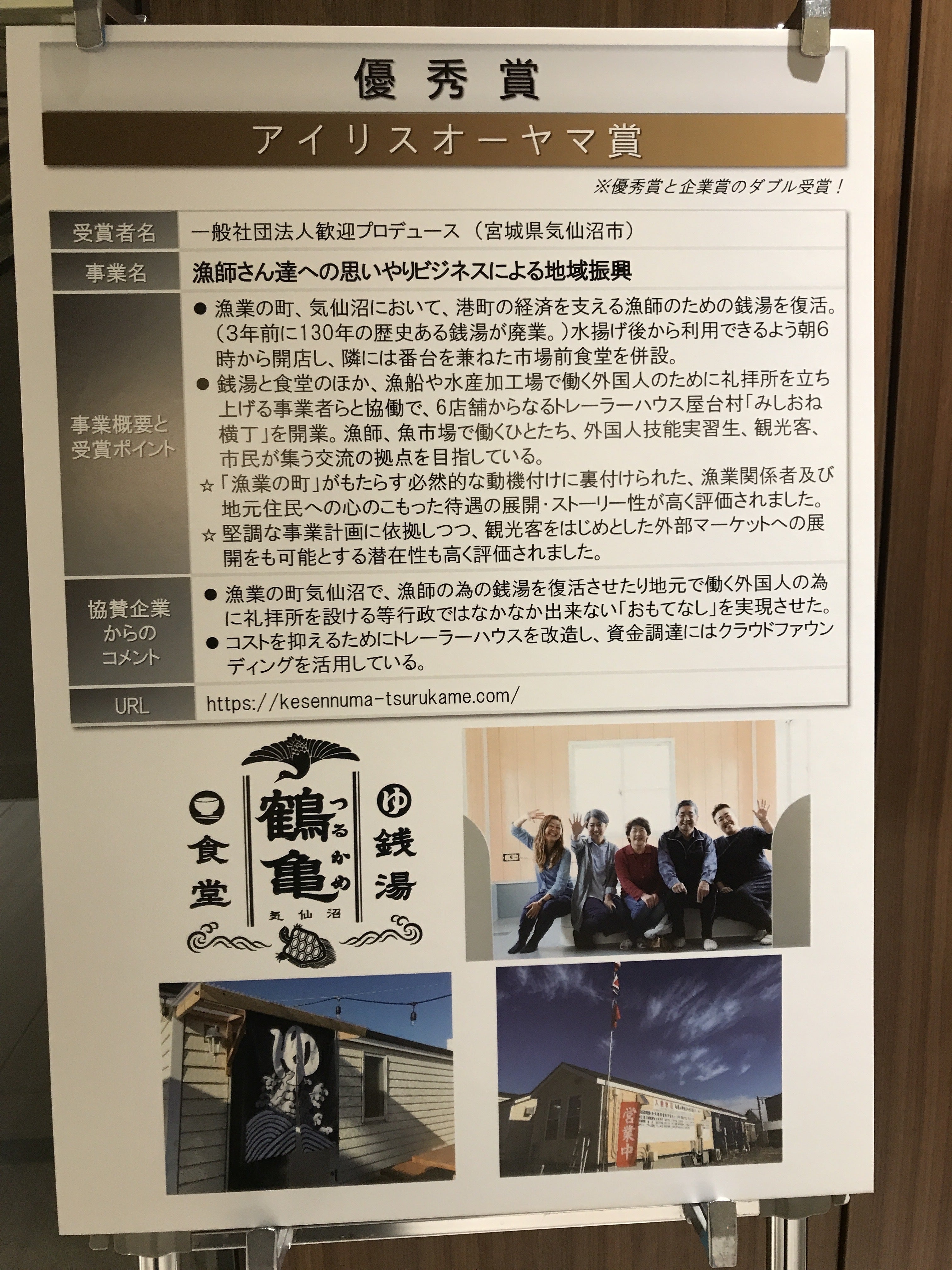 このたび、「新しい東北」復興ビジネスコンテスト2019にて、「鶴亀の湯・鶴亀食堂」が優秀賞と企業賞(アイリスオーヤマ賞)のダブル受賞をいただきました。